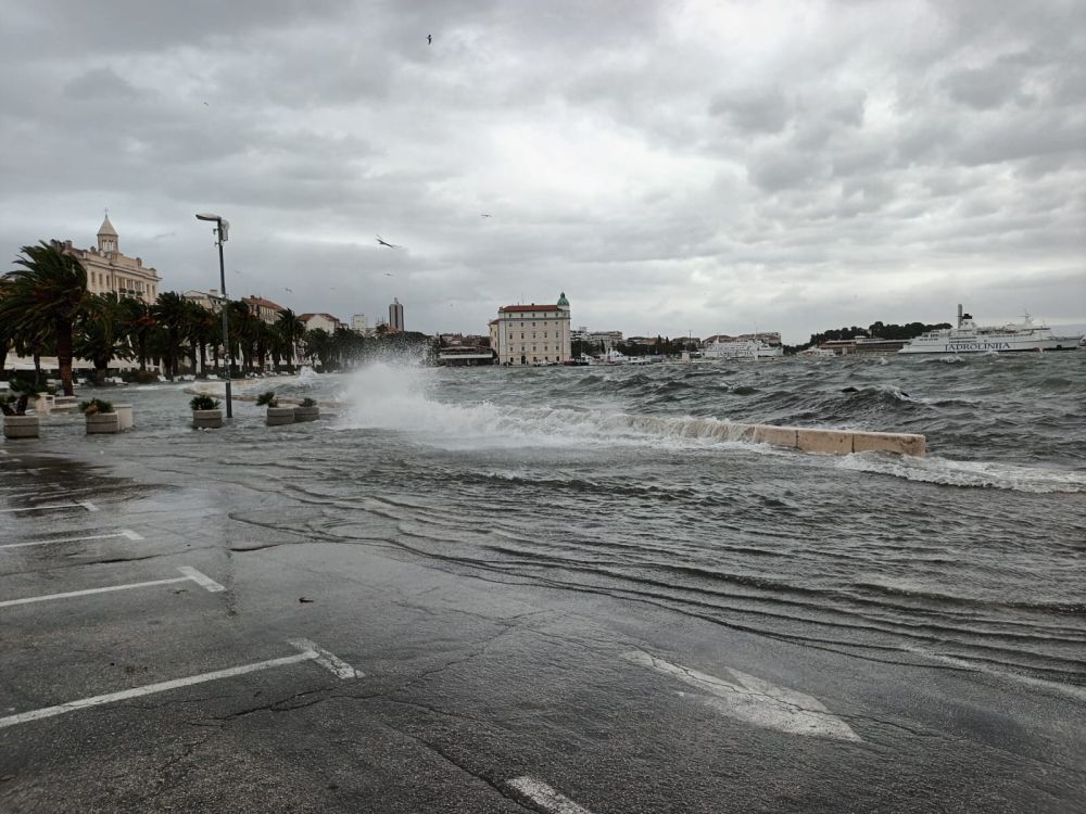 U prekidu je i pomorski saobraćaj, a na splitskoj Rivi stanje je dramatično. More je doprlo do kafića, izbilo je šahte.