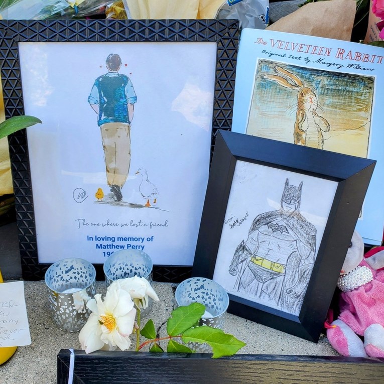 Uz razne bukete, na ulazu u kuću ostavljene su fotografije na kojima su glumci iz Prijatelja, svijeće, razni kadrovi iz scena u kojima je Chandler, crtež Batmana kojeg je Matthew obožavao, a najviše pažnje privlači velika čarapa koja visi pored vrata i na kojoj je Matthew s kolegama iz kultne serije.