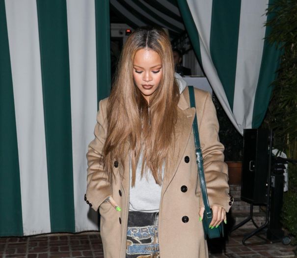 Osnivačica Fenty Beauty obukla je sivu majicu s kapuljačom, sive traperice s dezenom i dugački kaput neutralne boje. Izašla je u San Vicente Bungalows u zapadnom Hollywoodu, privatni klub u koji mogu ući samo odabrani članovi.