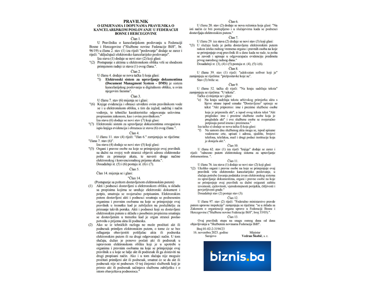 Ključne izmjene Pravilnika odnose se na elektronske potpise. Iza riječi "poslovanje" dodaje se zarez i u nastavku navodi: "uključujući elektronsko kancelarijsko poslovanje".