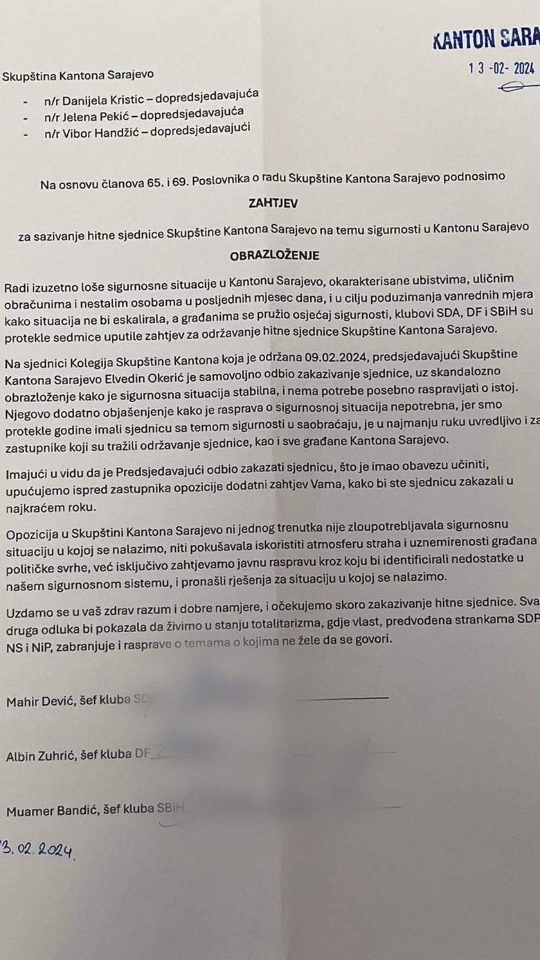 "Radi izuzetno loše sigurnosne situacije u Kantonu Sarajevo, okarakterisane ubistvima, uličnim obračunima i nestalim osobama u posljednjih mjesec dana, i u cilju poduzimanja vanrednih mjera kako situacija ne bi eskalirala, a građanima se pružio osjećaj sigurnosti, klubovi SDA, DF i SBiH su protekle sedmice uputili zahtjev za održavanje hitne sjednice Skupštine Kantona Sarajevo", navedeno je u zahtjevu.