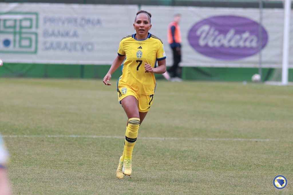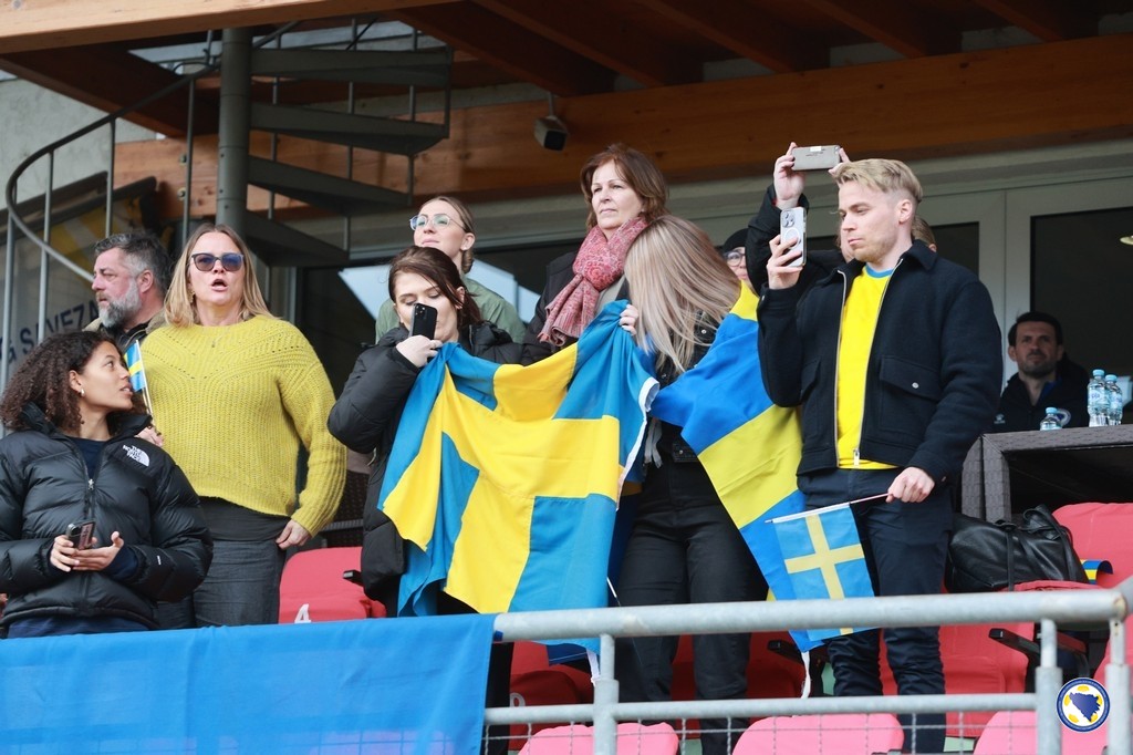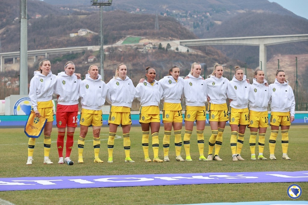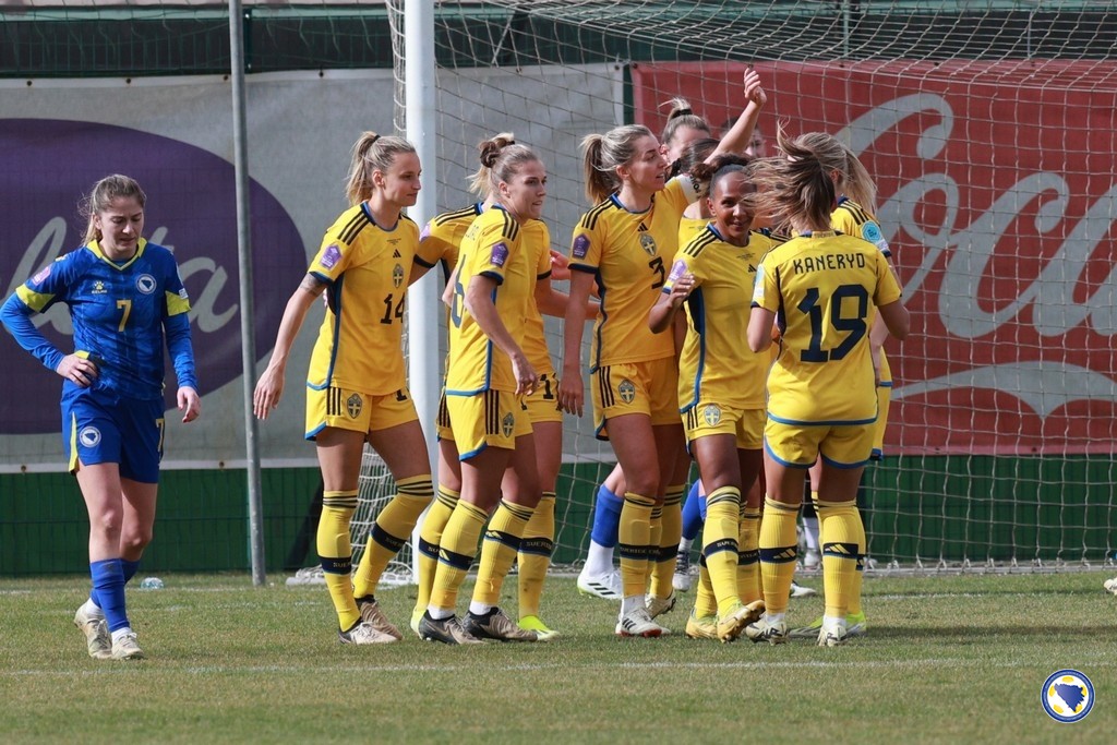 Švedska dolazi do prednosti u 6' kad nakon dobre akcije Madelen Janogy glavom sa peterca loptu šalje u mrežu. Tri minute poslije u dobroj poziciji se našla Maja Jelčić, ali nije najbolje zahvatila loptu. Stina Blackstenius u 18' izlazi sama na gol bh.tima, a Jelena Gvozderac odlično interveniše. Još jednu priliku gošće imaju u 24' kad Rosa Kafaji pogađa prečku. Janogy postiže još jedan gol u 41' nakon kornera.