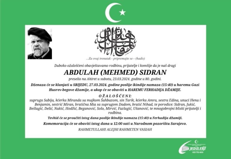 Dženaza književniku, pjesniku i scenaristi Abdulahu Sidranu bit će održana u srijedu u haremu Ferhadija džamije u Sarajevu.