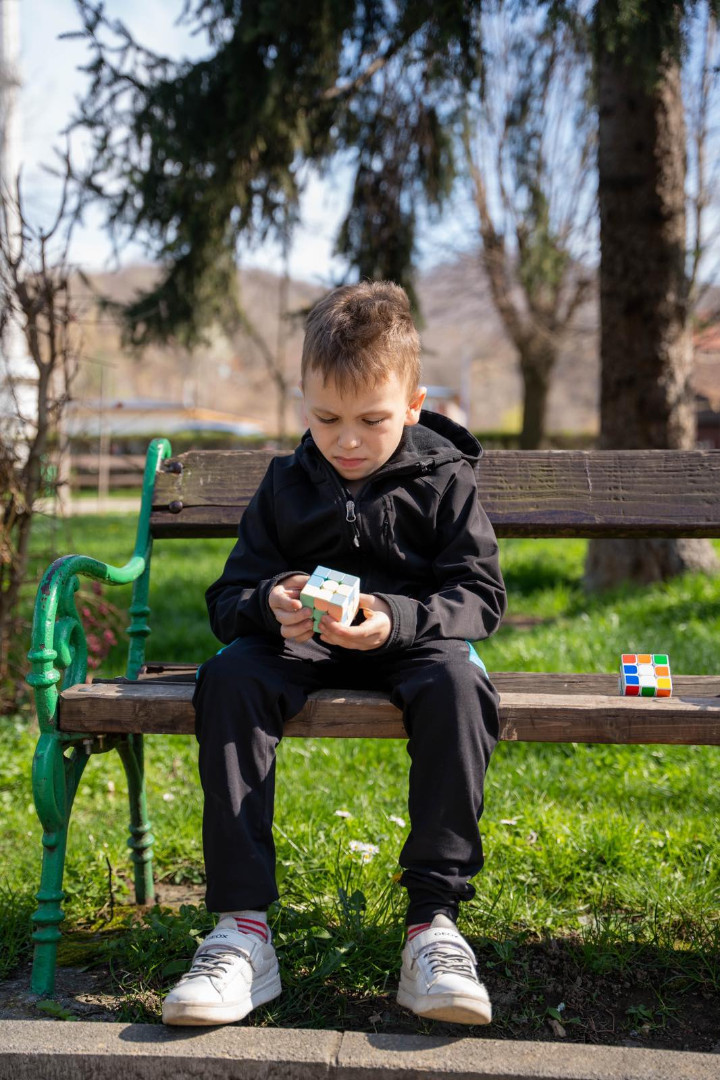 Vještinu slaganja Rubikovih kocki razvijao je postepeno, nakon što je na Internetu vidio kako je sklapaju drugi. To je izazovna igra koja zahtijeva logičko razmišljanje, pažnju i strpljenje. Savladao je algoritme i sada slaganje boja vježba na kockama koje imaju po tri reda kockica na jednoj rubnoj strani, ali i po šest redova, pa čak i onim slagalicama koje umjesto kocki za osnovu imaju trokut, ali se slažu po istom algoritmu. Kockice uglavnom kupuje na putovanjima gdje ide s roditeljima i starijim bratom, koji nije naročito zainteresovan za ovaj hobi.