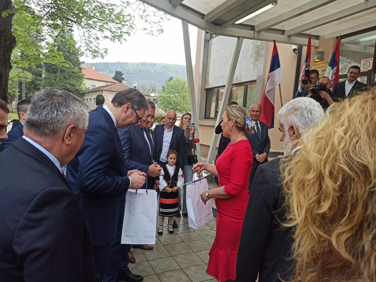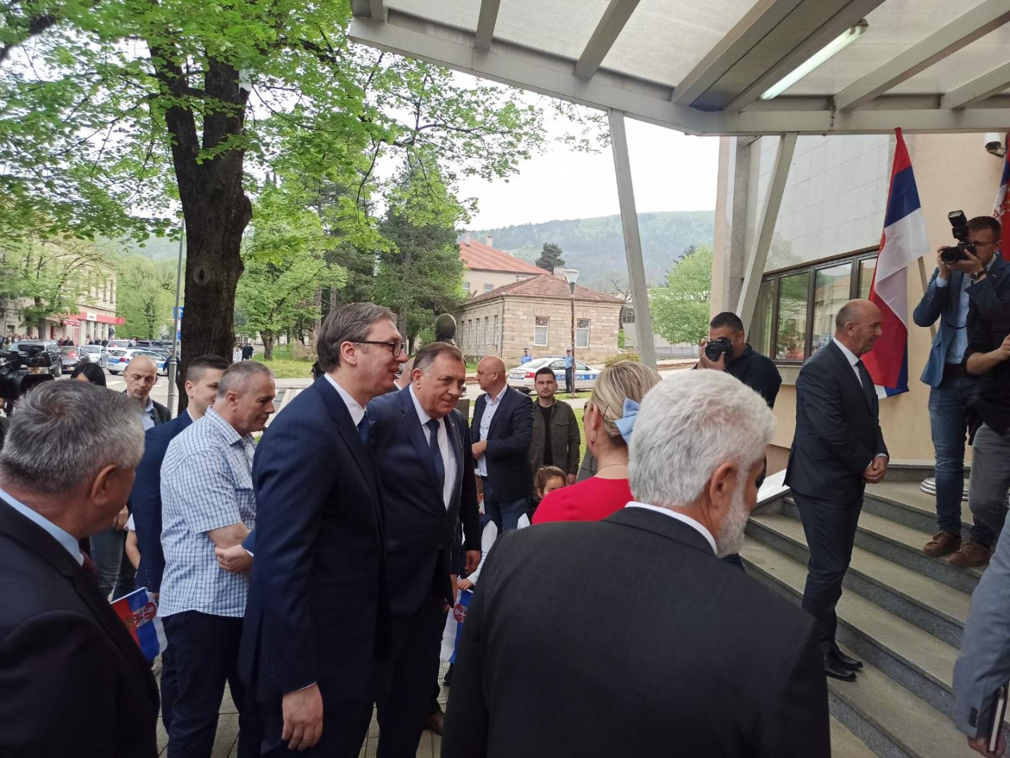 Dodika i Vučića po dolasku u Bileću dočekao je veliki broj građana, kao i djeca iz vrtića "Budućnost" obučena u narodne nošnje
