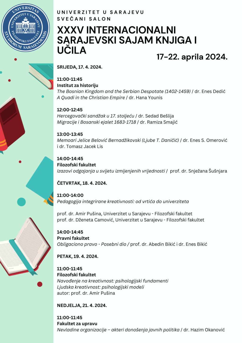 Fakulteti, akademije i instituti Univerziteta u Sarajevu predstavit će, na sajamskom štandu, razvijenu izdavačku djelatnost - naučnu produkciju. Bit će organizirani promotivni časovi jezika i kulture za osnovce, srednjoškolce i bibliotekare.