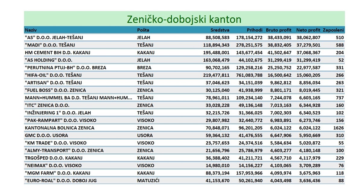 Top 20 komapanija iz ZDK, kantona za kojeg se nerijetko kaže da je motor razvoja FBiH, imalo je prihode veće od dvije milijarde KM, te su ostvarile dobit veću od 260 milona KM. Najviše ih je iz Tešnja, pa i ne čudi činjenica da je ovaj grad dospio na listu renomiranog svjetskog časopisa “Financial Times” među top deset mikrogradova budućnosti.