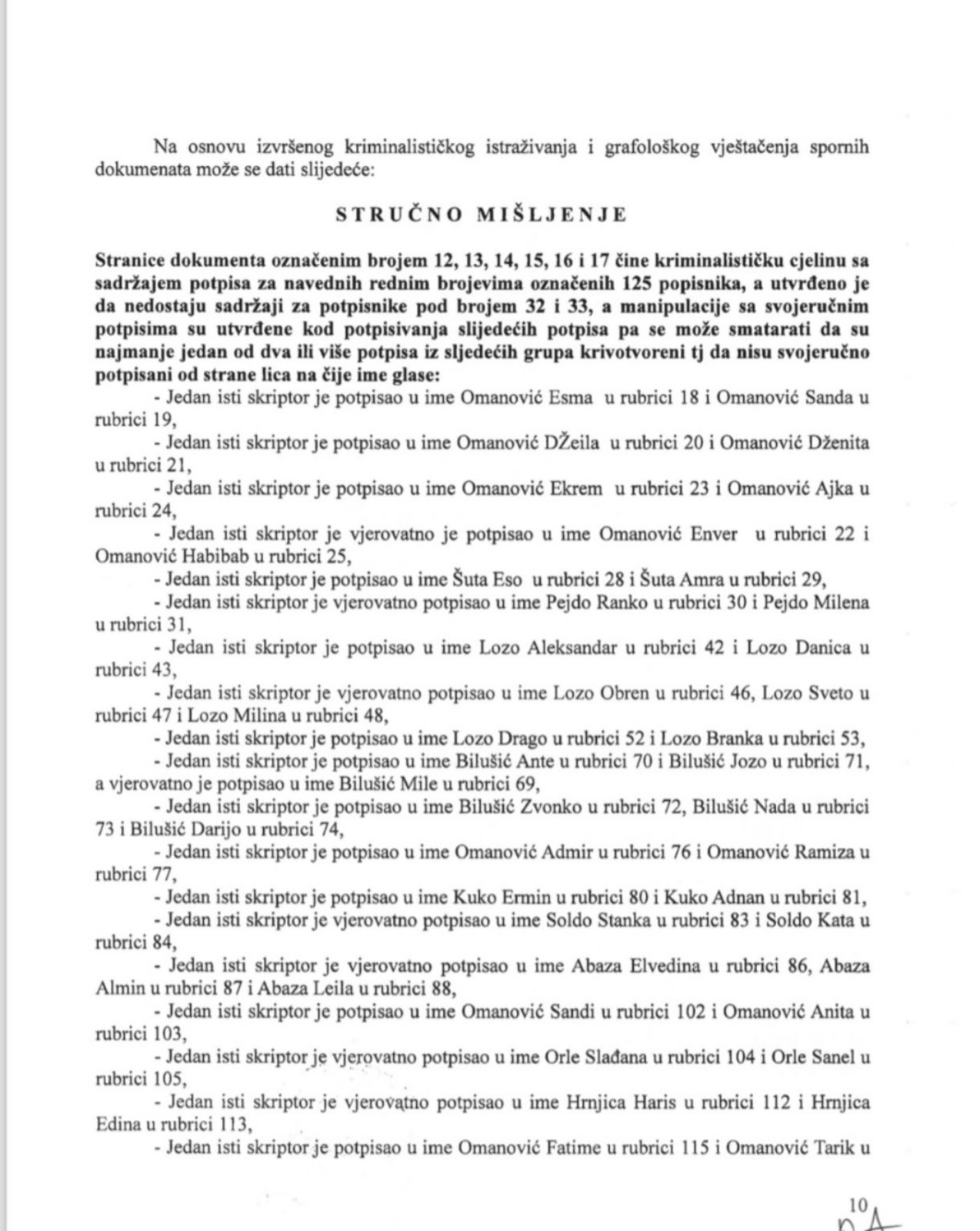 Prema onome što se vidi iz stručnog mišljenja vještaka, većina manipulacija – krivotvorenja je uočena kod prezimena Omanović i Lozo.