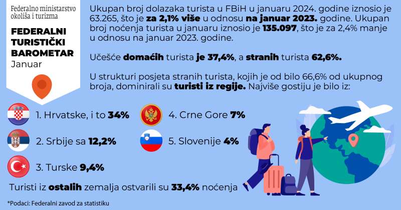 Prema podacima federalnog turističkog barometra, u januaru ove godine u Federaciji BiH bilo je 63.000 turista, što je također za 2,1 posto više u odnosu na januar prethodne godine.