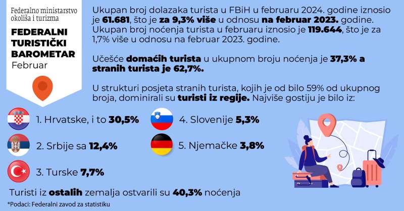 - Za prva tri ovogodišnja mjeseca u odnosu na isti period 2023. ostvareno je povećanje za 3,35 posto. Ovo su pokazatelji da će se i tokom cijele godine nastaviti trend povećanja broja turista. Izazovi su brojni, ali trendovi nam idu na ruku, kao i mogućnosti naše zemlje koje se ukazuju otvaranjem pregovora sa Evropskom unijom. Raduju i nove avio-linije, naročito sa Sarajevskog aerodroma, a što otvara mogućnost dodatnog povećanja broja turista - saopćeno je iz Federalnog ministarstva okoliša i turizma.