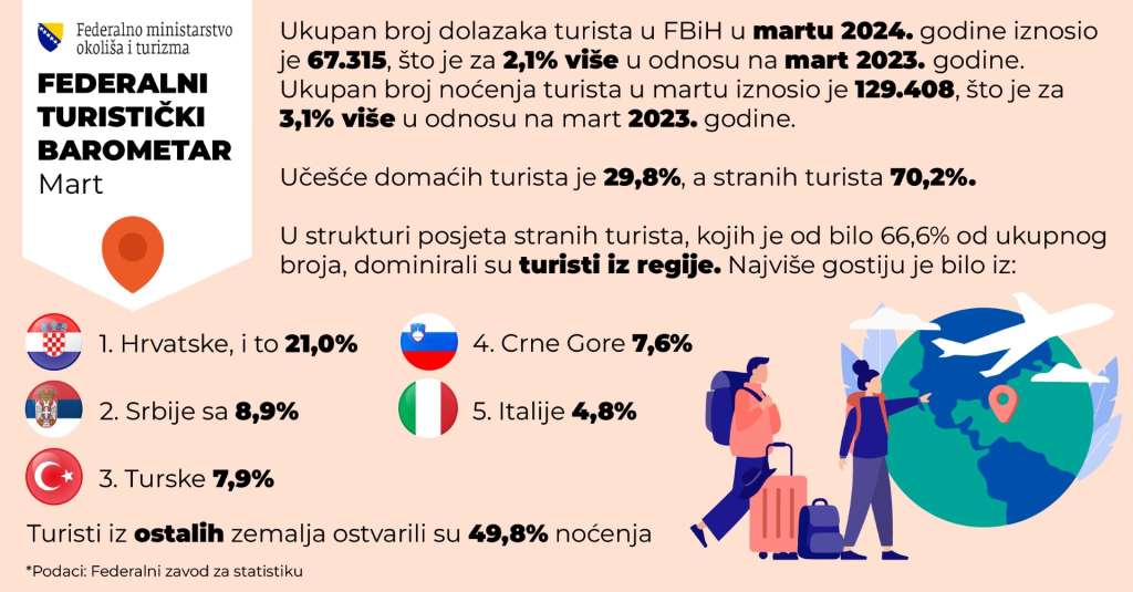 - Tokom marta ove godine ukupan broj dolazaka turista iznosio je 67.315, što je za 2,1 posto više nego u martu 2023. godine. Ukupan broj noćenja turista u martu je iznosio 129.408, što je za 3,1 posto više u odnosu na isti mjesec prošle godine. Učešće domaćih turista je oko 30 posto, a stranih oko 70 posto. U strukturi stranih turista najviše su dominirali gosti iz regije, iz Srbije i Hrvatske, kao i Crne Gore, a značajan udio imaju i turisti iz Turske, Italije, Slovenije, Njemačke i Austrije - navodi se u saopćenju resornog federalnog ministarstva.
