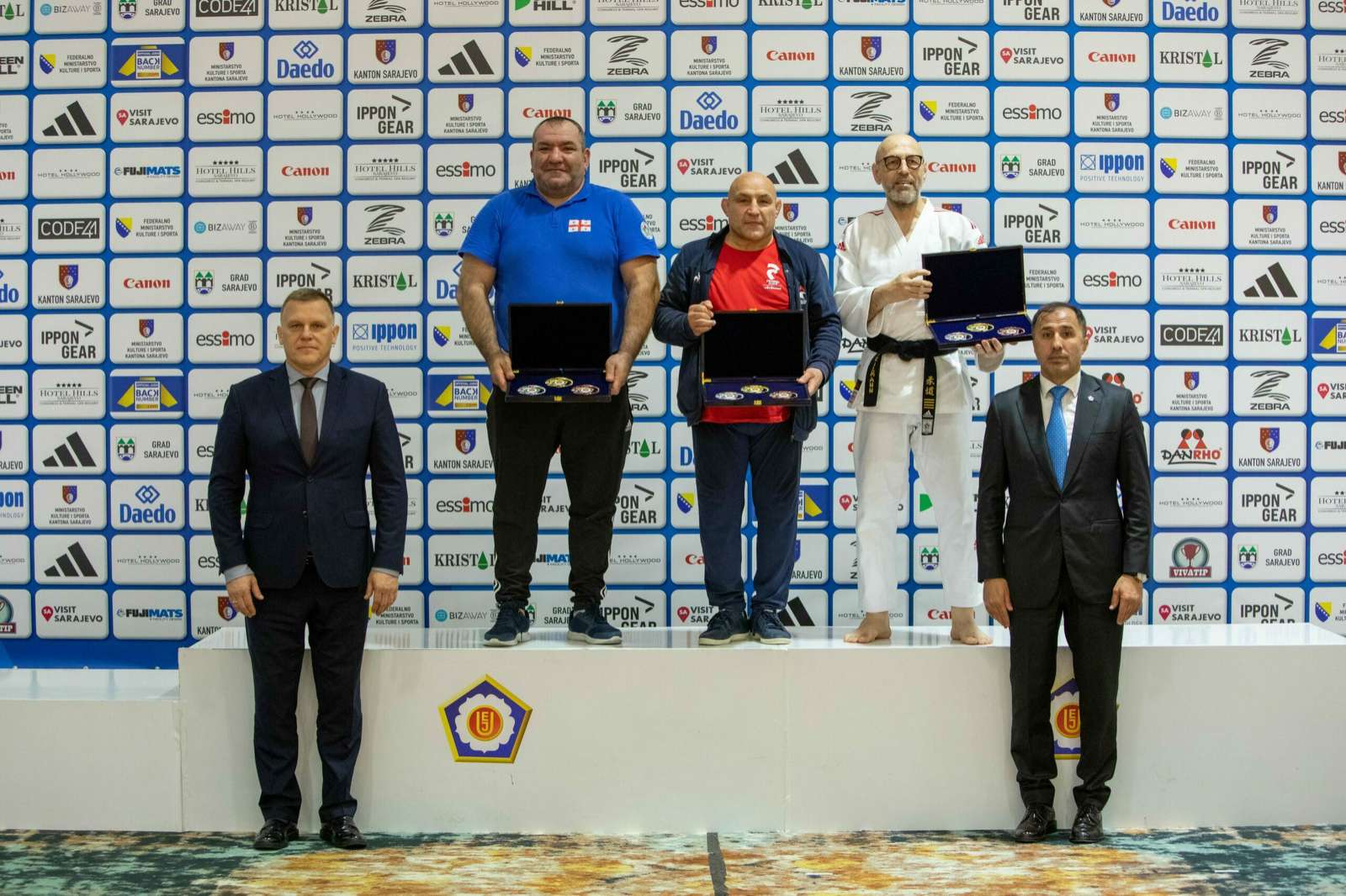 Prije dodjele medalja i pehara, čovjek koji je najzaslužniji što Bosna i Hercegovina sjajno kotira u evropskim i svjetskim džudo okvirima, prof. Branislav Crnogorac, predao je zastavu Evropske džudo unije predsjedniku Džudo federacije Latvije koja će naredne godine u Rigi ugostiti EP za veterane.