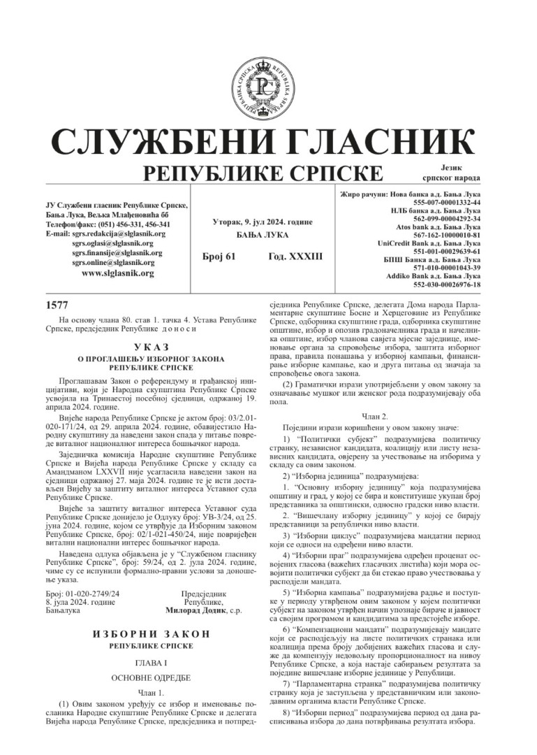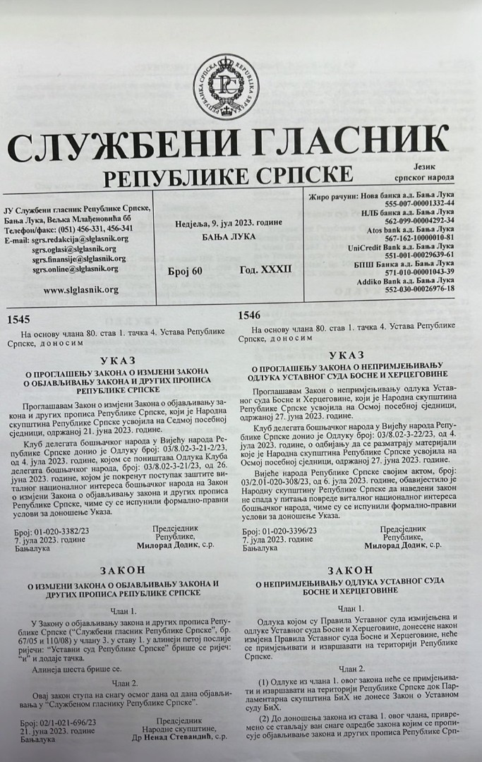 Vršilac dužnosti direktora Službenog glasnika RS Miloš Lukić objavio je na platformi X da su danas objavljeni Ukazi predsjednika RS o proglašenju Zakona o referendumu i Izbornog zakona RS.