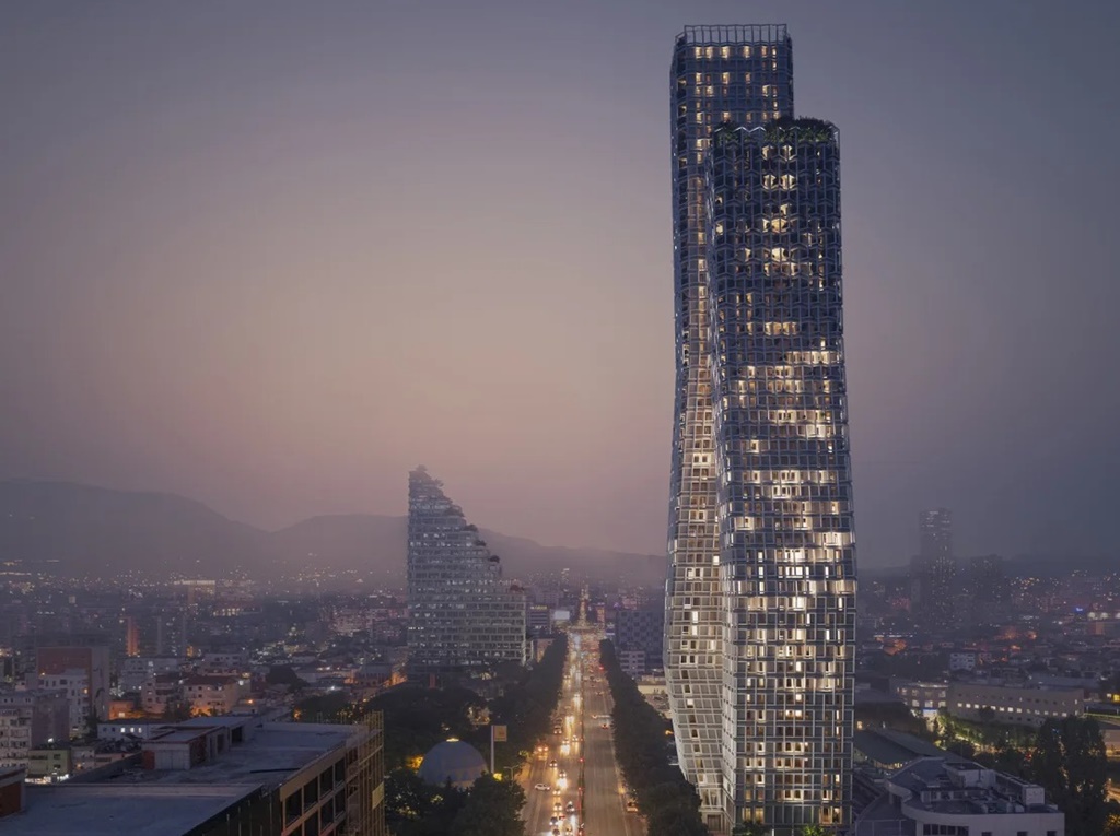 U glavnom gradu Albanije, Tirani, gdje će niz novih tornjeva uskoro transformisati horizont, arhitekti su otkrili planove za novi dvostruki neboder koji će se elegantno savijati poput baletnog pliea (pregib koljena u baletu) ili ljubavnika koji se naginje za poljubac.