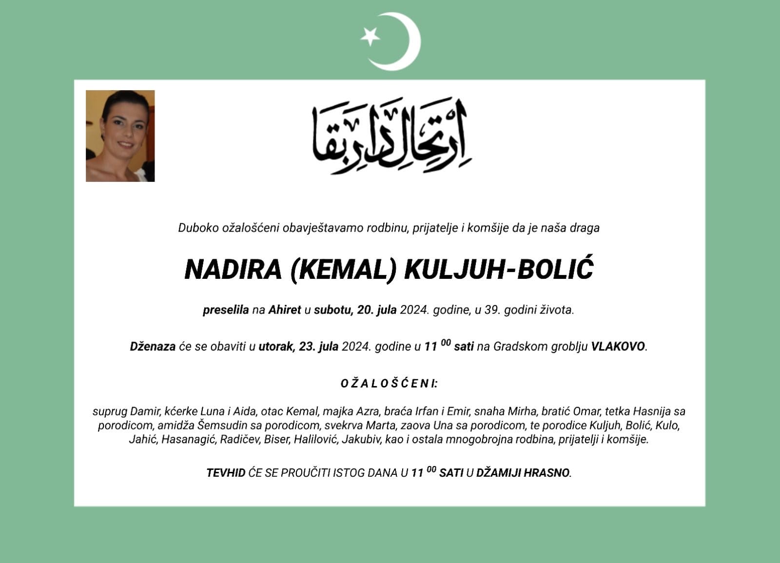 Nadira Kuljuh-Bolić, viša asistentica na Katedri za Arhitektonske konstrukcije i tehnologiju građenja na Arhitektonskom fakultetu u Sarajevu preminula je 20. jula u 39. godini.