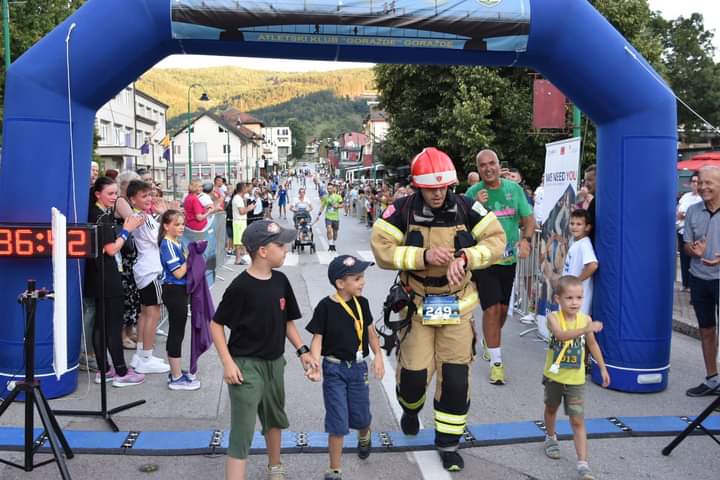 Vatrogasac VD Vogošća Jasmin Žigić trčao je u punoj vatrogasnoj uniformi u subotu 27. jula Međunarodnu trku prijateljstva "Goražde 5K", u okviru zajedničkog projekta udruženja Pomozi.ba i Vatrogasnog Društva Vogošća "Kupi kilometar, spasi život".