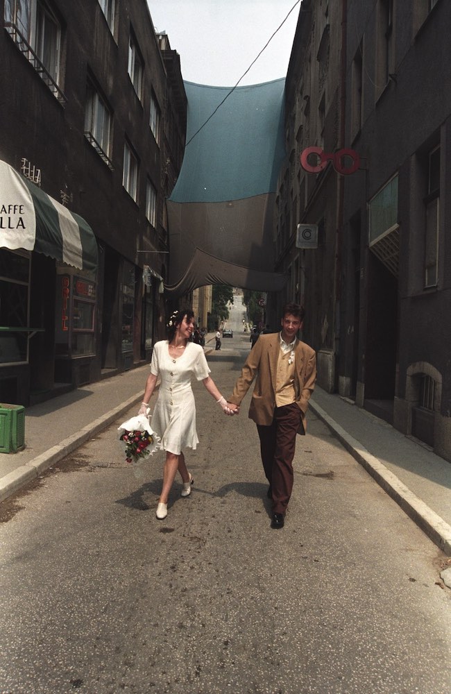 Među eksponatima izložbe, između ostalih, nalazi se fotografija čuvenih sarajevskih mladenaca koja se danas smatra jednom od najvažnijih fotografija u istoriji ratne fotografije. Sanela i Emir Klarić vjenčali su se 1995. godine u opkoljenom Sarajevu. Mladenci šetaju Kulovićevom ulicom, a u pozadini se vide platna razapeta između zgrada, koja su štitila od napada snajpera sa okolnih brda. Fotografija nasmijanih mladenaca postala je simbol borbe i otpora Sarajlija, kao i nade i vjere u bolju budućnost.