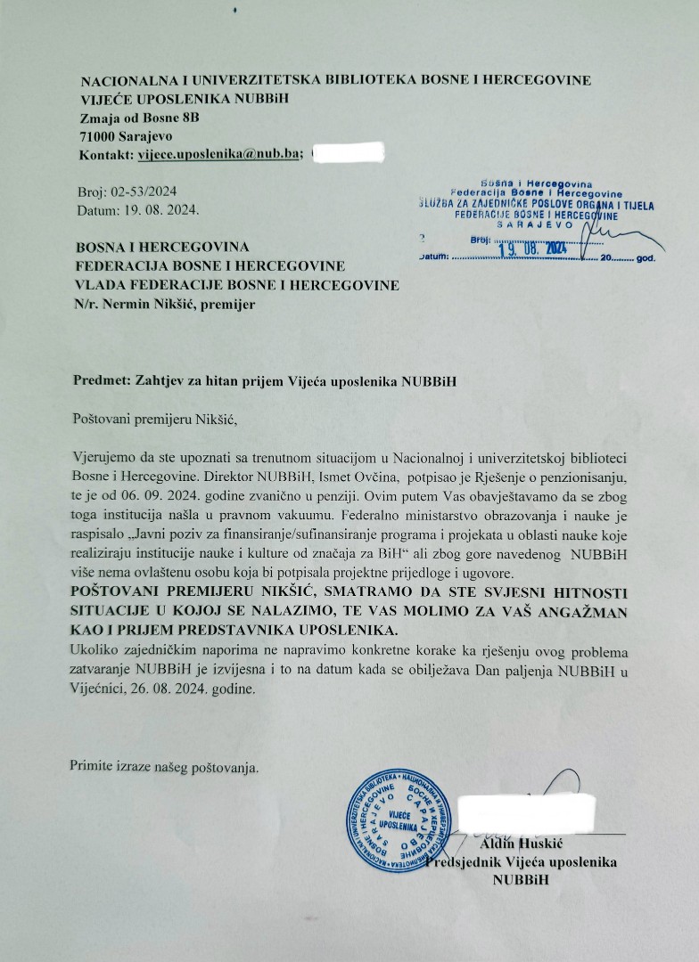 Još jednom apeliramo nadležne institucije da se aktivno uključe u rješavanje pravnih i financijskih problema, a ukoliko se ništa drastično ne promjeni po tom pitanju radnici će morati obustaviti pružanje usluga na godišnjicu agresorskog paljenja NUBBIH u Vijećnici 1992 godine, " navidu se u dopisu Vijeća uposlenika NUBBIH.