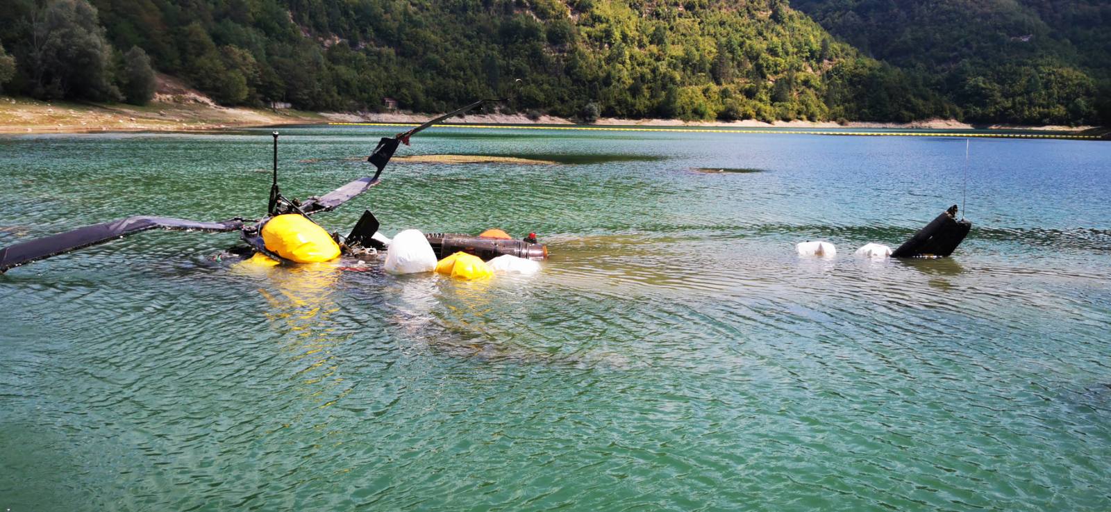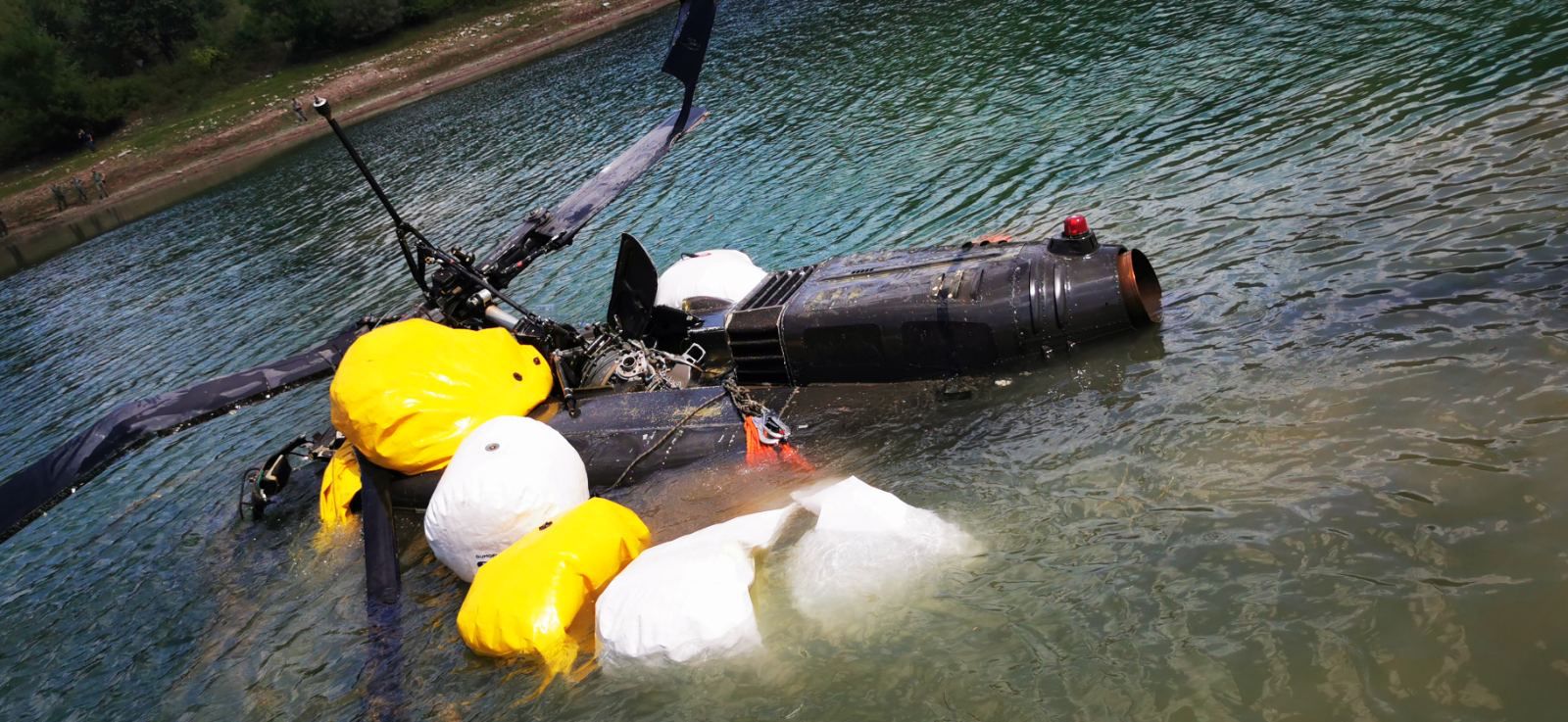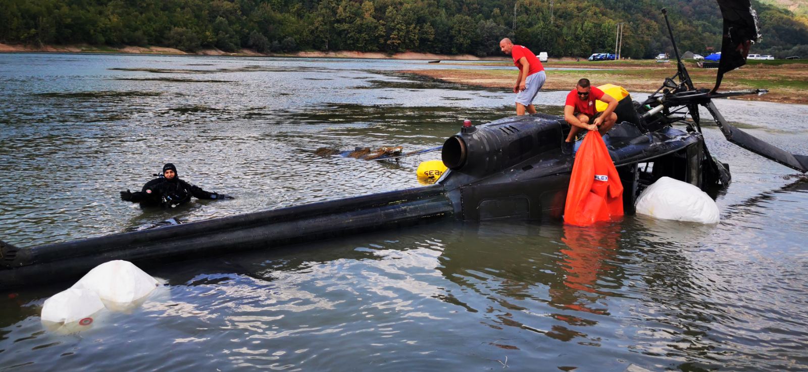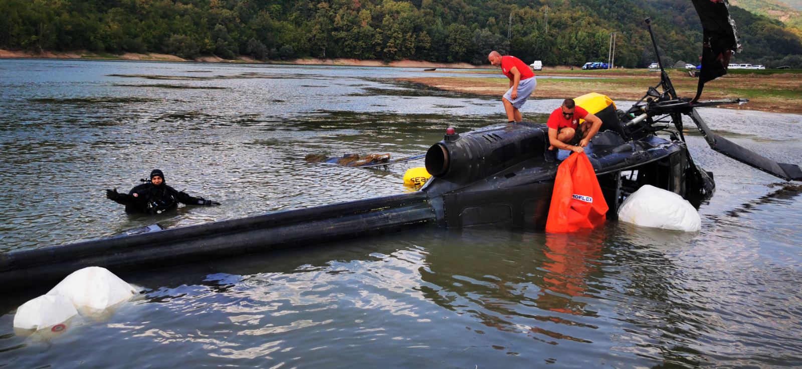 - Letjelica se na jezerskom dnu nalazila na rotorskoj elisi na maloj dubini, odnosno plitko u vodi što je zaista otežavalo dalji rad. Plan je bio da padobranima na napuhavanje okrenemo helikopter na tzv. skije, kako bi ga zakačili i na skijama izvukli na obalu sa minimalnim oštećenjima. Radi se o kompleksnoj podvodnoj operaciji pristupanja, sigurnog i pravilnog vezivanja, balansiranog rotiranja, vertikalnog lifta-podizanja, a zatim horizontalnog privlačenja ka obali.