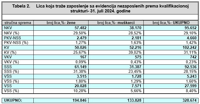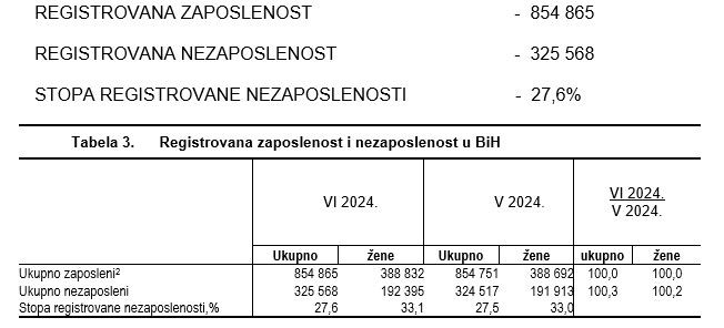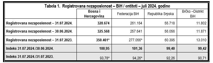 Prema podacima zavoda i službi zapošljavanja u Bosni i Hercegovini sa 31.07.2024. godine na evidencijama je prijavljeno 328.674 nezaposlena lica, što u odnosu na 30.06.2024. godine predstavlja povećanje za 3.106 lica ili 0,95%. Od ukupnog broja lica koja traže zaposlenje, njih 194.846 ili 59,28% su žene.