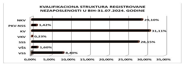 Najveći broj evidentirane nezaposlenosti čine lica sa trećim stepenom obrazovanja KV radnici 31,11%, zatim NKV radnici 29,10%, te radnici sa SSS 28,15%, piše Biznis.ba.