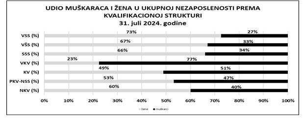 Posmatrano prema kvalifikacionoj strukturi, udio nezaposlenih žena manji je kod visokokvalifikovanih (VKV) - 23% i kvalifikovanih (KV) - 49% radnica, u odnosu na udio nezaposlenih muškaraca u ukupnom broju nezaposlenih lica. Kod ostalih kvalifikacija više je nezaposlenih žena nego muškaraca.