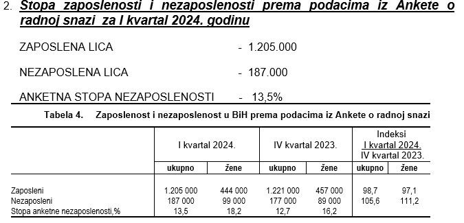 U okviru radne snage zaposlenih je bilo 1.205.000 i 187.000 nezaposlenih lica. Anketna stopa nezaposlenosti je značajno manja od registrovane i na nivou BiH za I kvartal 2024. godine iznosila je 13,5%.