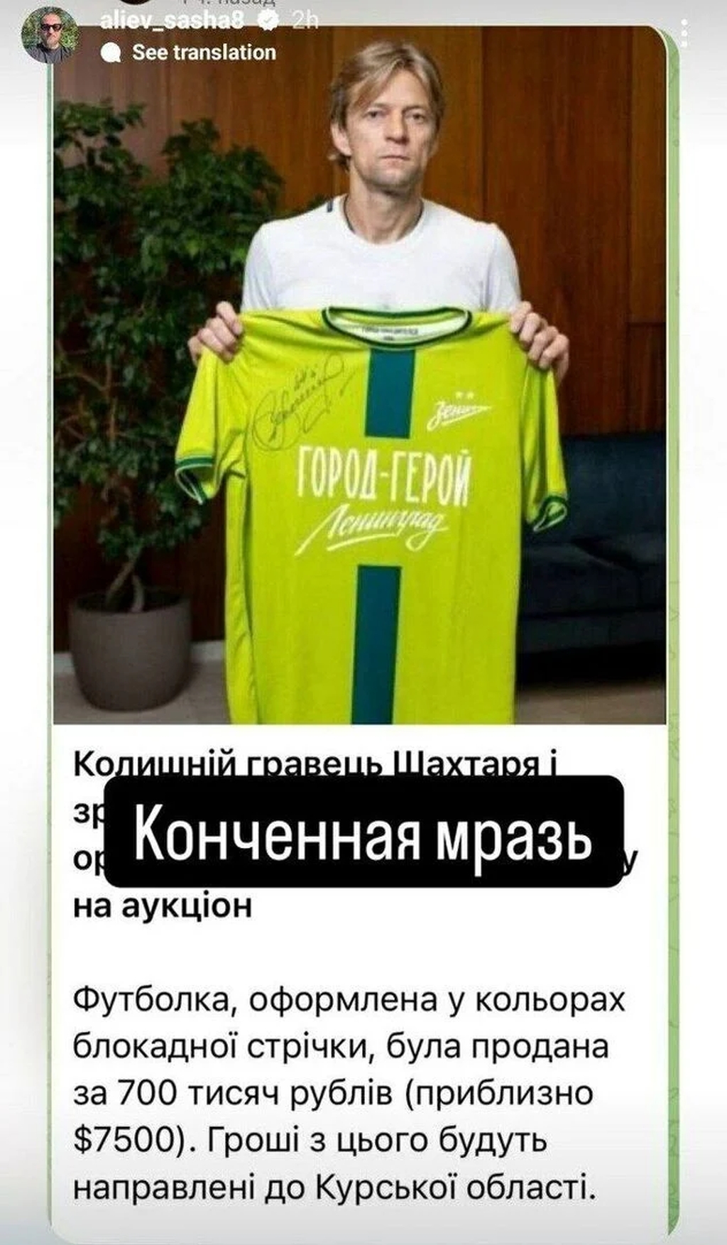 Timoščuk je na aukciji prodao dres Zenita, a dobijeni novac, u iznosu od približno 6.500 eura, donirao je za pomoć Rusima u regionu Kursk, gde su ukrajinske trupe napale početkom augusta, piše portal sport.ua.