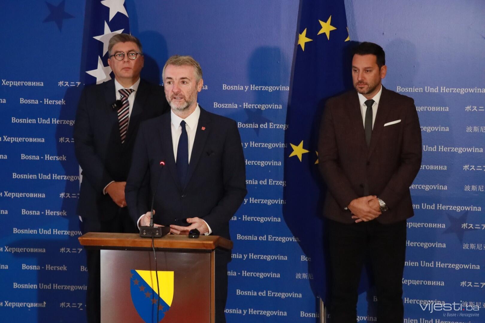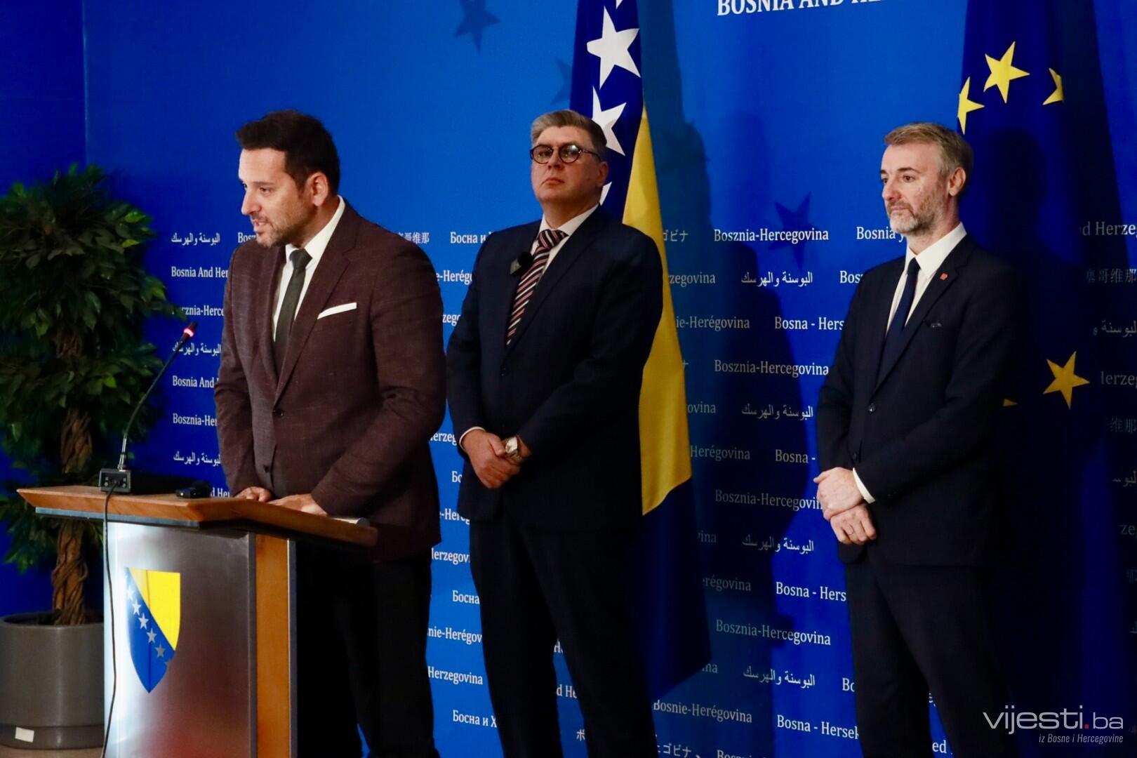 Konferencija za medije Ministra komunikacija i saobraćaja BiH Edina Forte, sa direktorima IDDEEA i BH Telecoma, Almirom Badnjevićem i Amelom Kovačevićem, na kojoj je najavljeno uvođenje novih elektronskih usluga održana je danas u Zgradi institucija BiH.