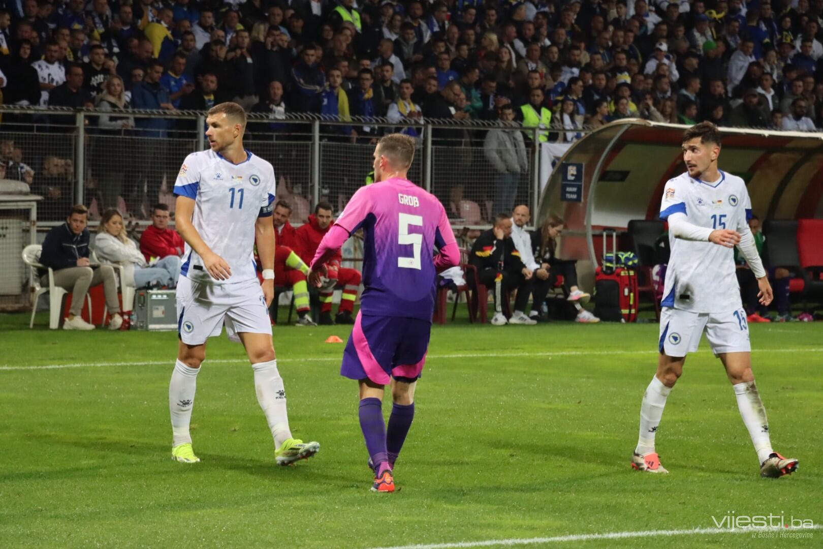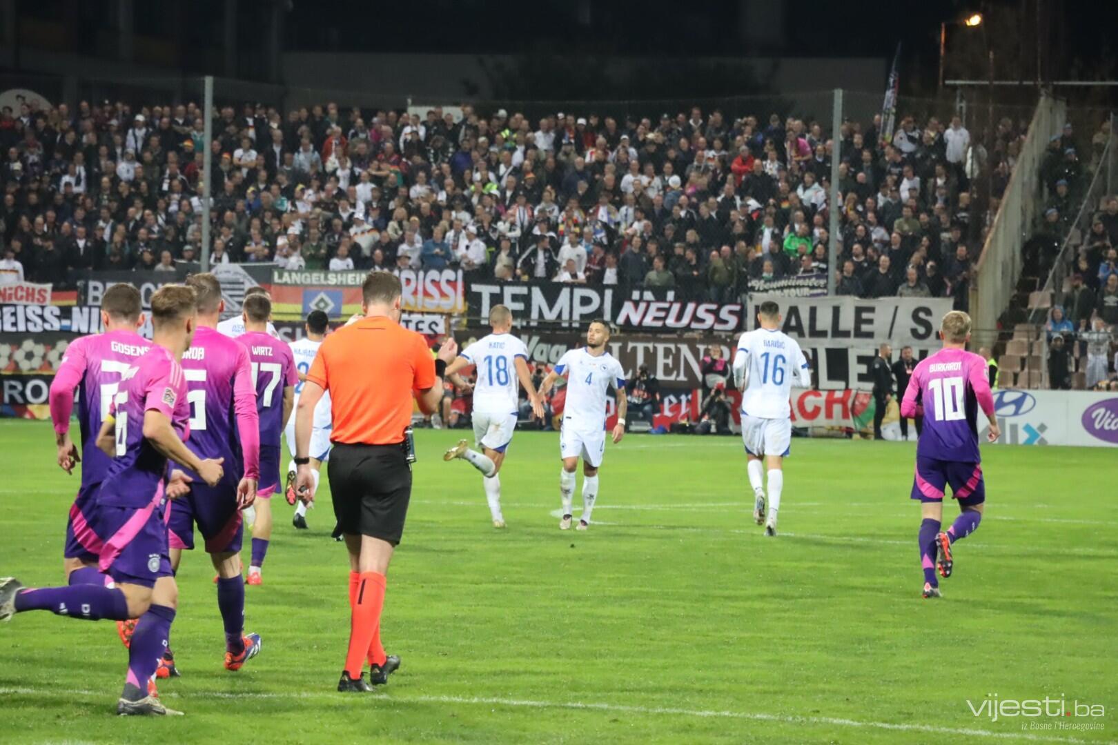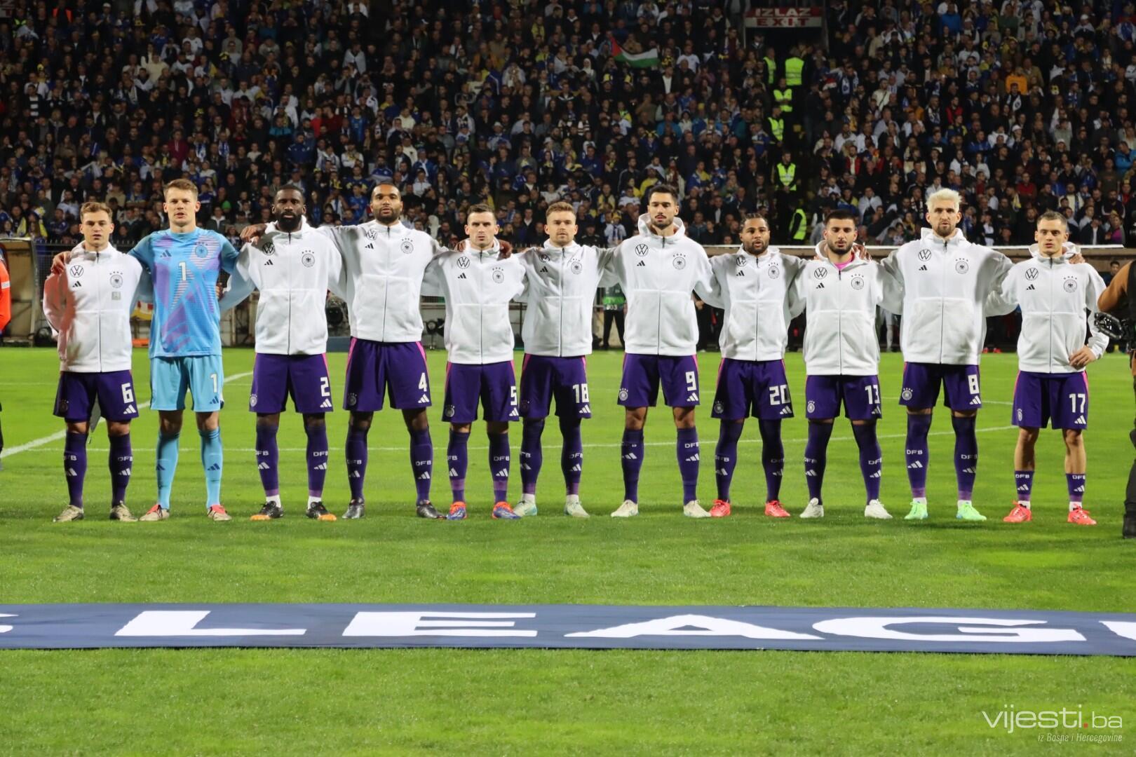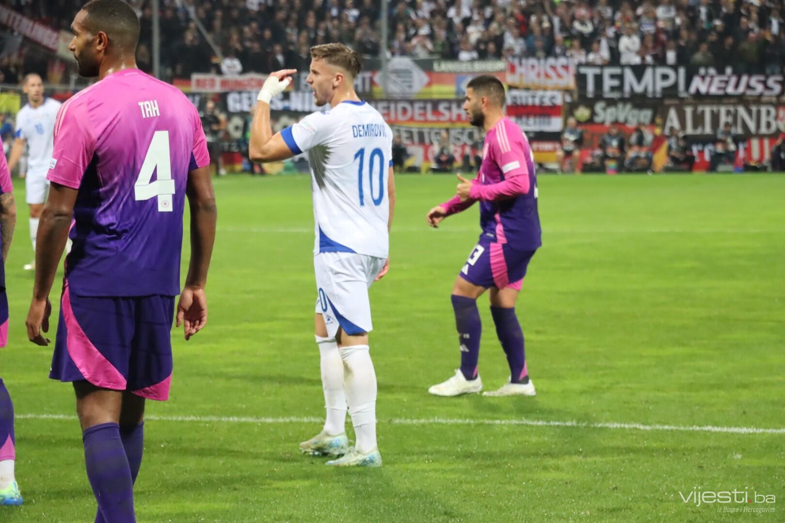 Naša reprezentacija je utakmicu počela u sastavu: Vasilj, Gazibegović, Kolašinac, Barišić, Katić, Huseinbašić, Bašić, Gigović, Burnić, Demirović, Džeko. Za Njemačku su od prve minute igrali Nubel, Rudiger, Tah, Gross, Kimmich, Andrich, Kleindienst, Undav, Wirtz, Mittelstadt i Gnabry.