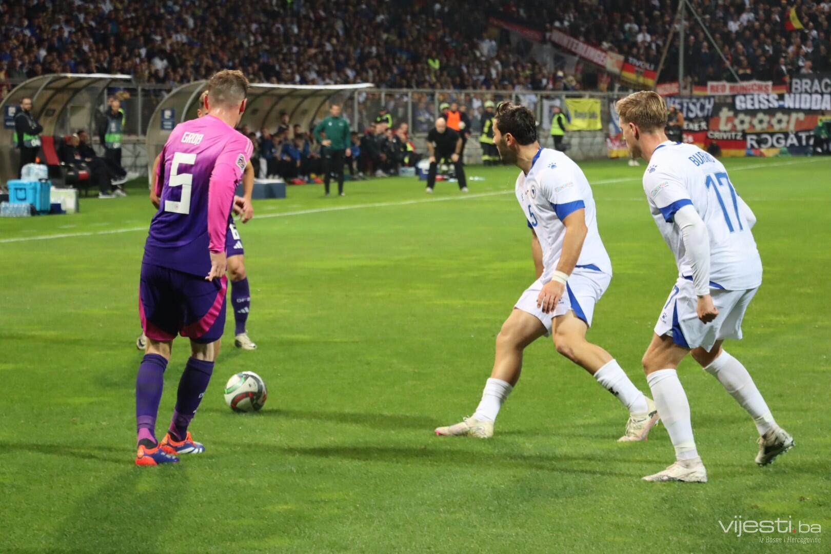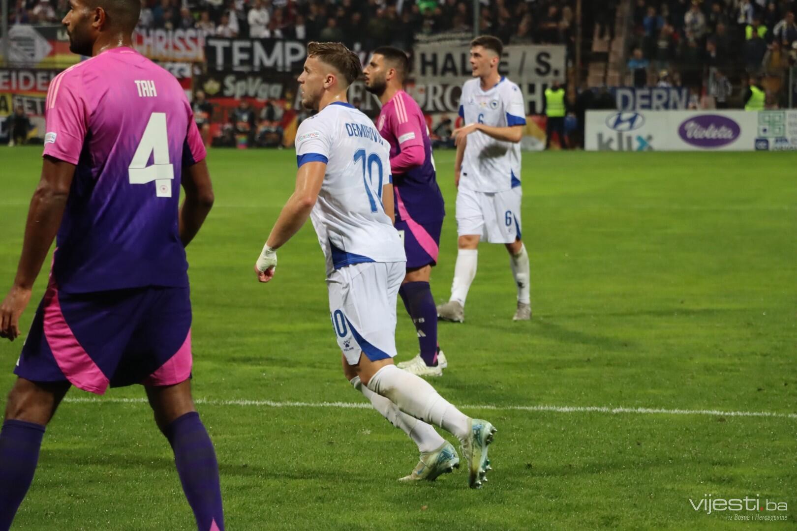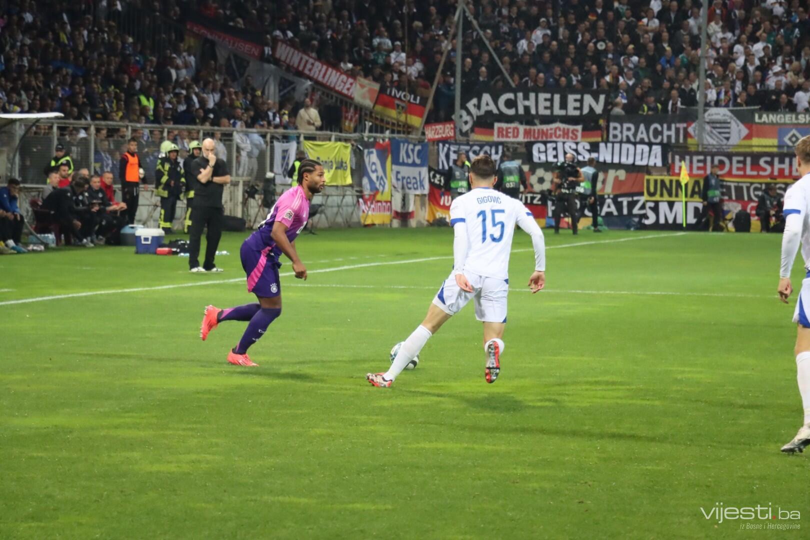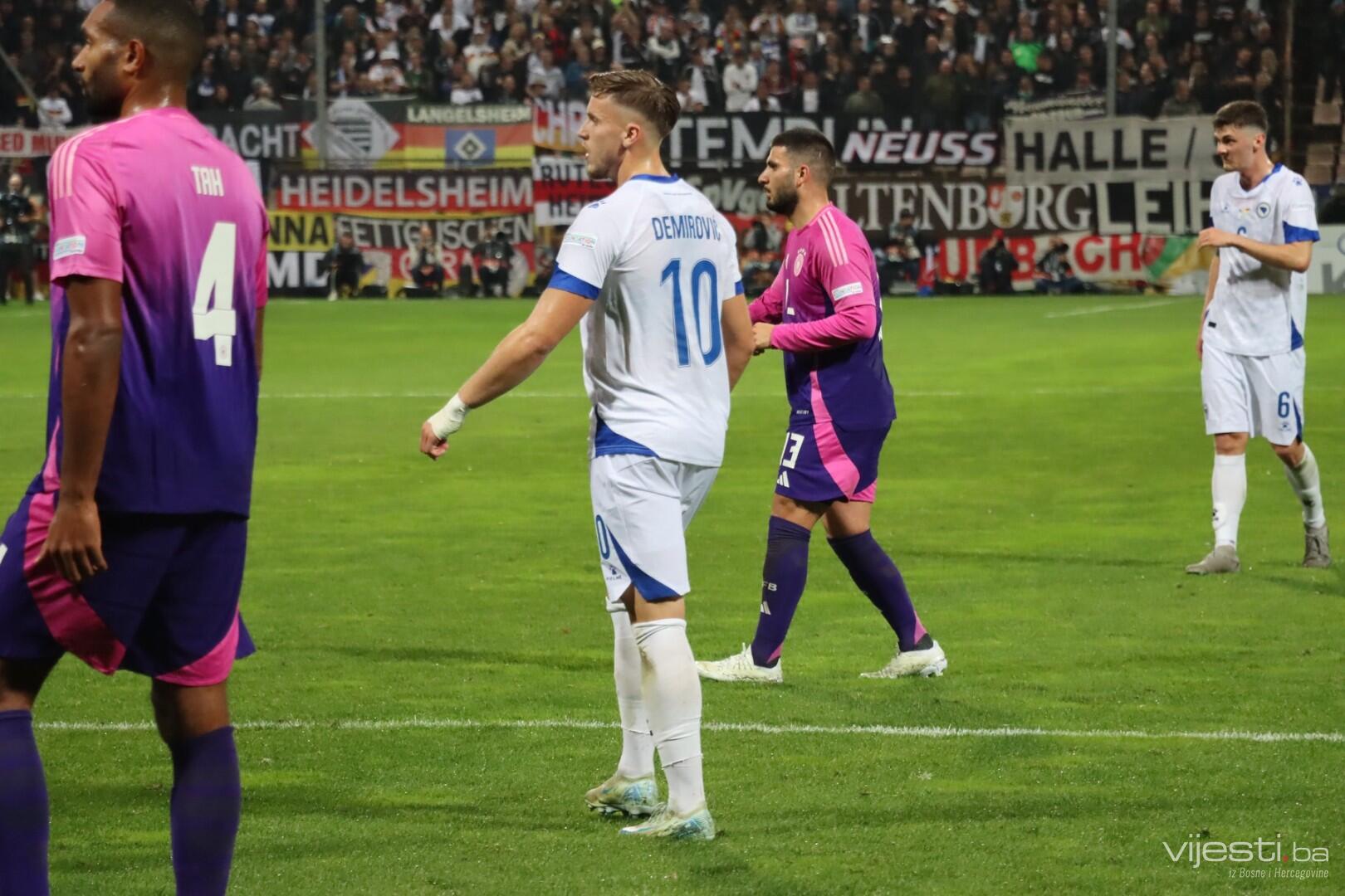 Naša reprezentacija je utakmicu počela u sastavu: Vasilj, Gazibegović, Kolašinac, Barišić, Katić, Huseinbašić, Bašić, Gigović, Burnić, Demirović, Džeko. Za Njemačku su od prve minute igrali Nubel, Rudiger, Tah, Gross, Kimmich, Andrich, Kleindienst, Undav, Wirtz, Mittelstadt i Gnabry.