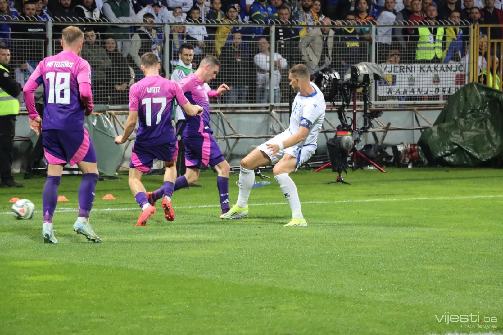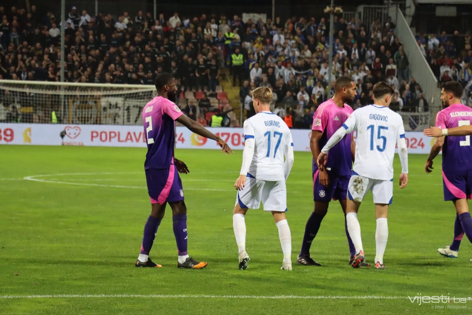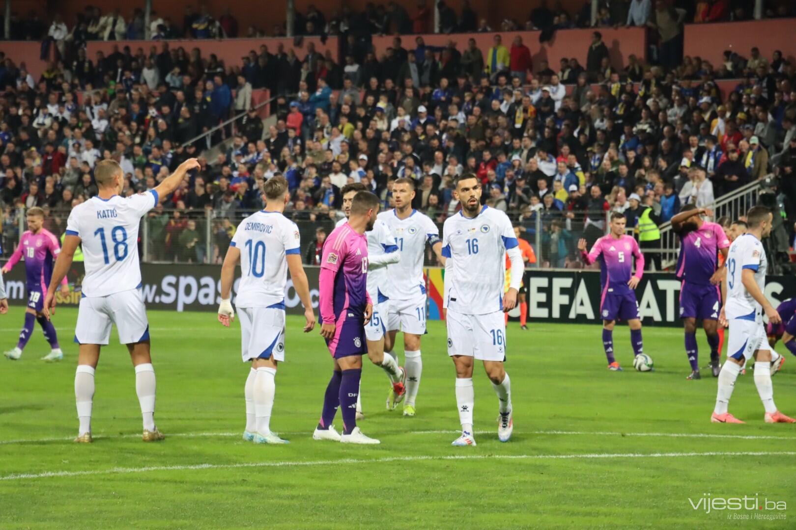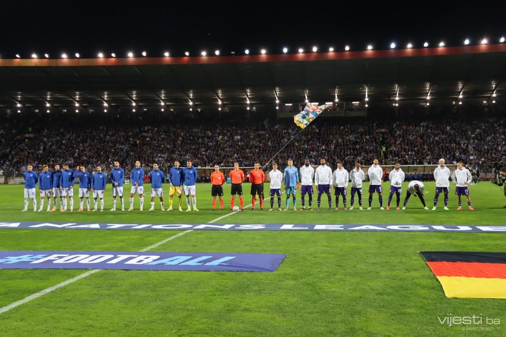 Naša reprezentacija je utakmicu počela u sastavu: Vasilj, Gazibegović, Kolašinac, Barišić, Katić, Huseinbašić, Bašić, Gigović, Burnić, Demirović, Džeko. Za Njemačku su od prve minute igrali Nubel, Rudiger, Tah, Gross, Kimmich, Andrich, Kleindienst, Undav, Wirtz, Mittelstadt i Gnabry.