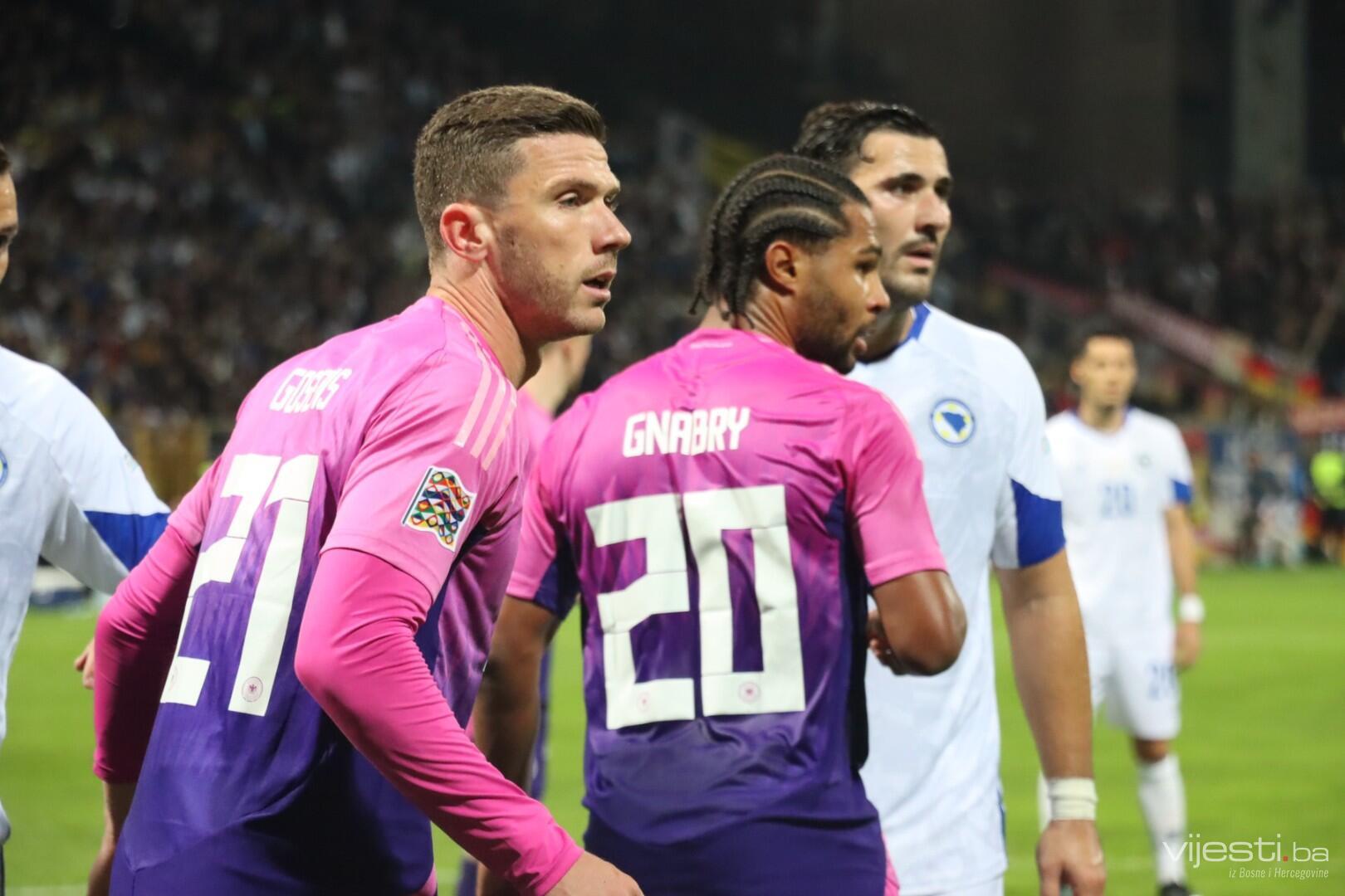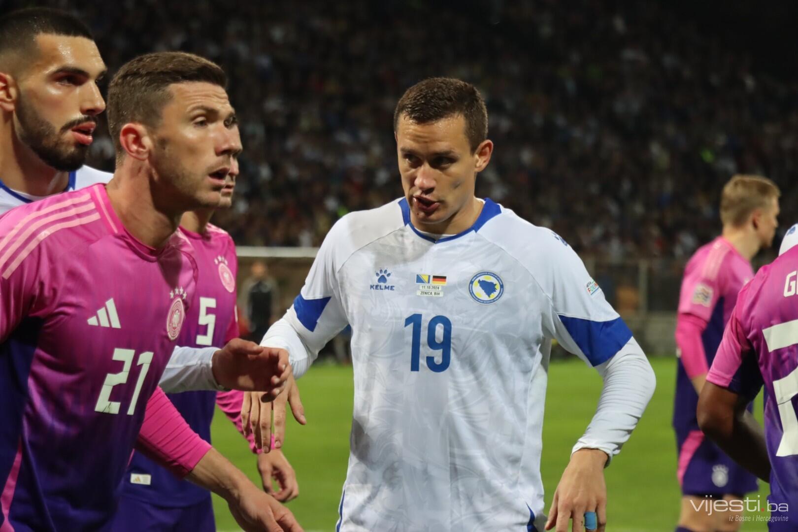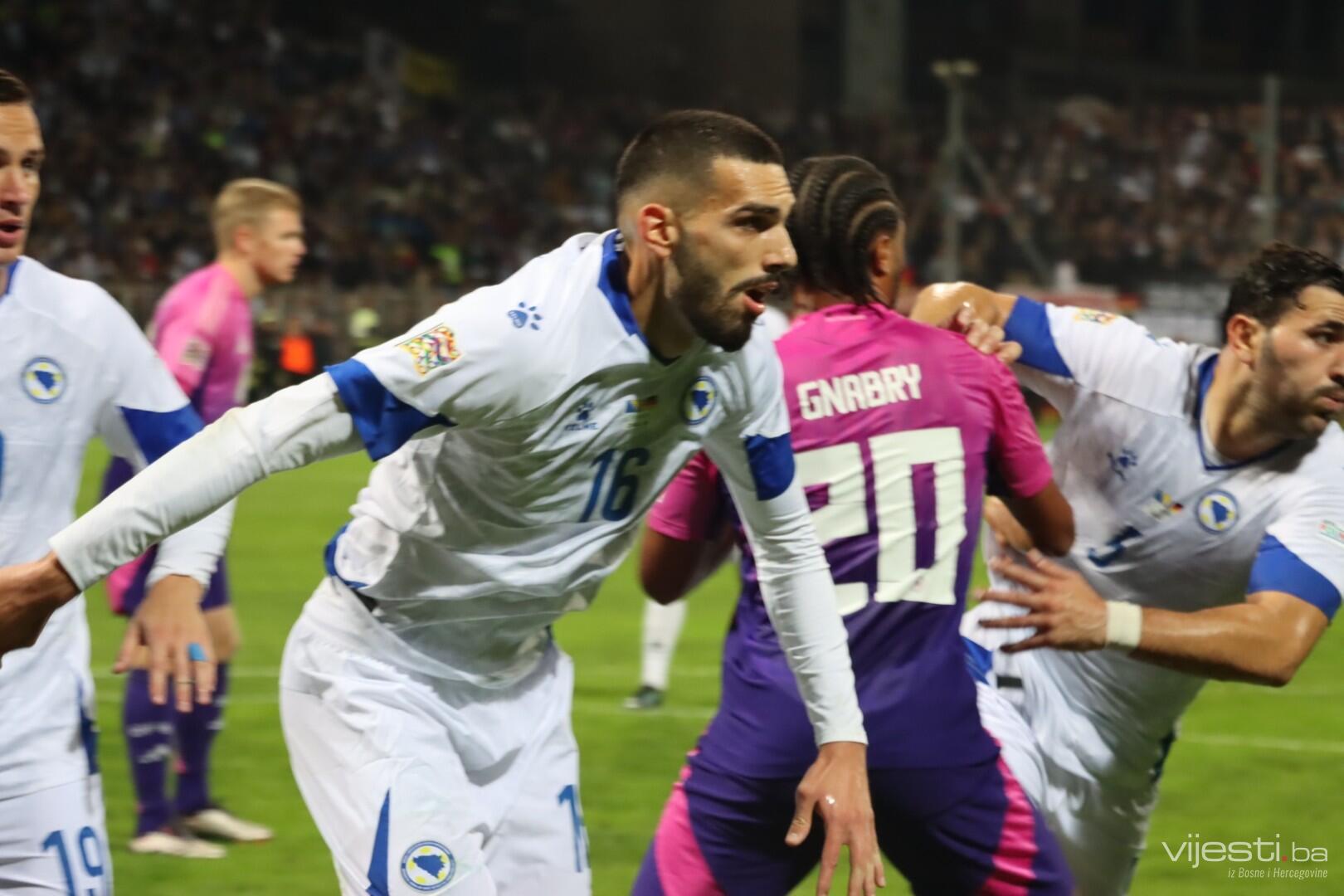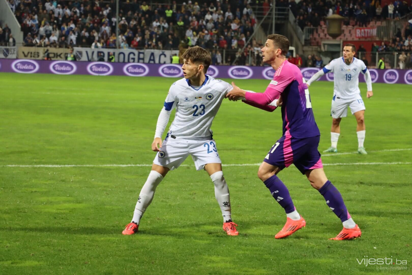 Naša reprezentacija je utakmicu počela u sastavu: Vasilj, Gazibegović, Kolašinac, Barišić, Katić, Huseinbašić, Bašić, Gigović, Burnić, Demirović, Džeko. Za Njemačku su od prve minute igrali Nubel, Rudiger, Tah, Gross, Kimmich, Andrich, Kleindienst, Undav, Wirtz, Mittelstadt i Gnabry.