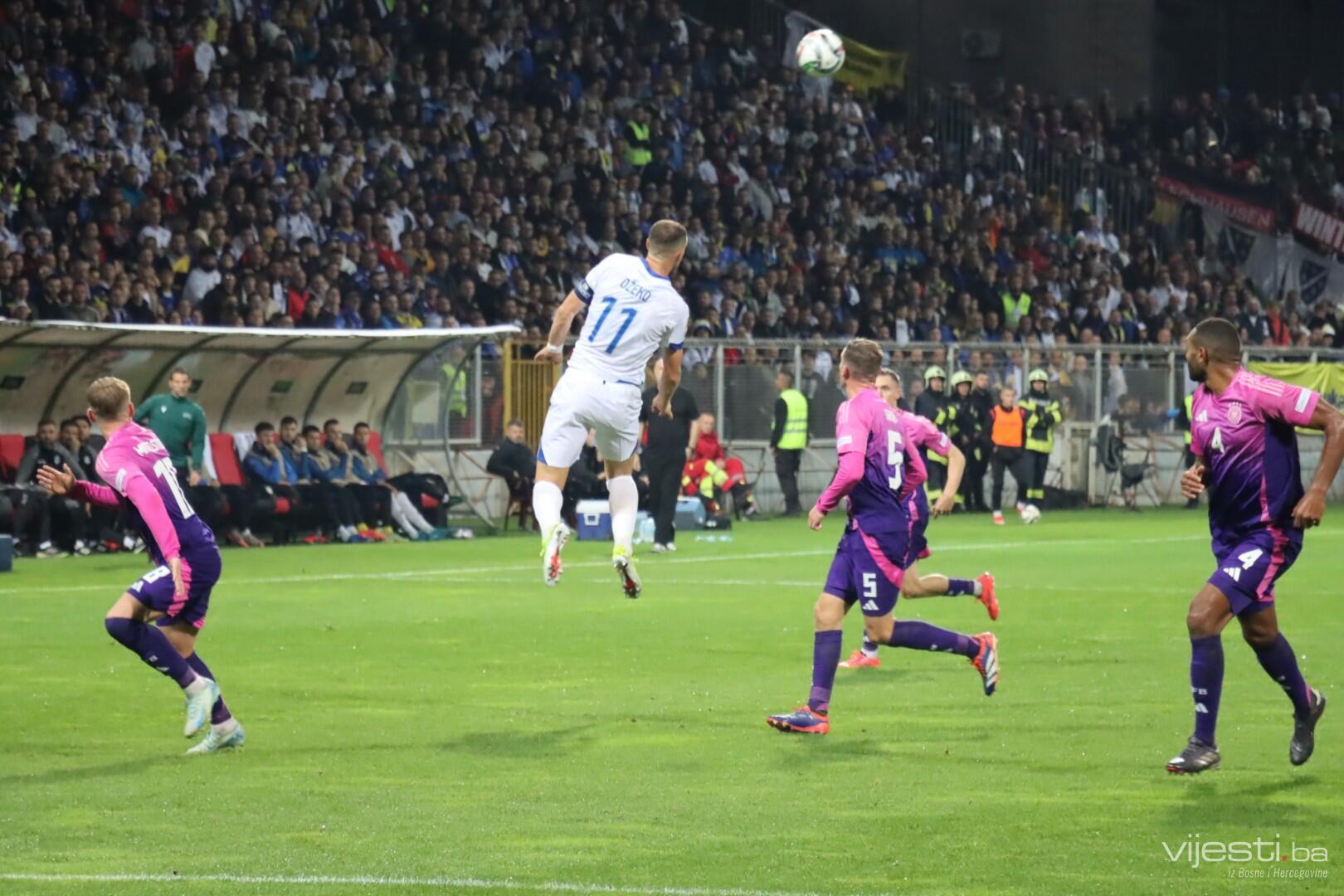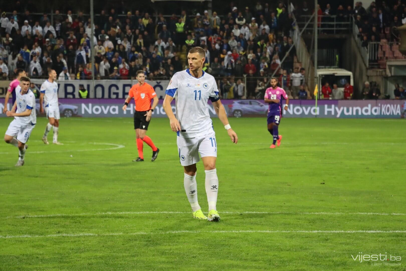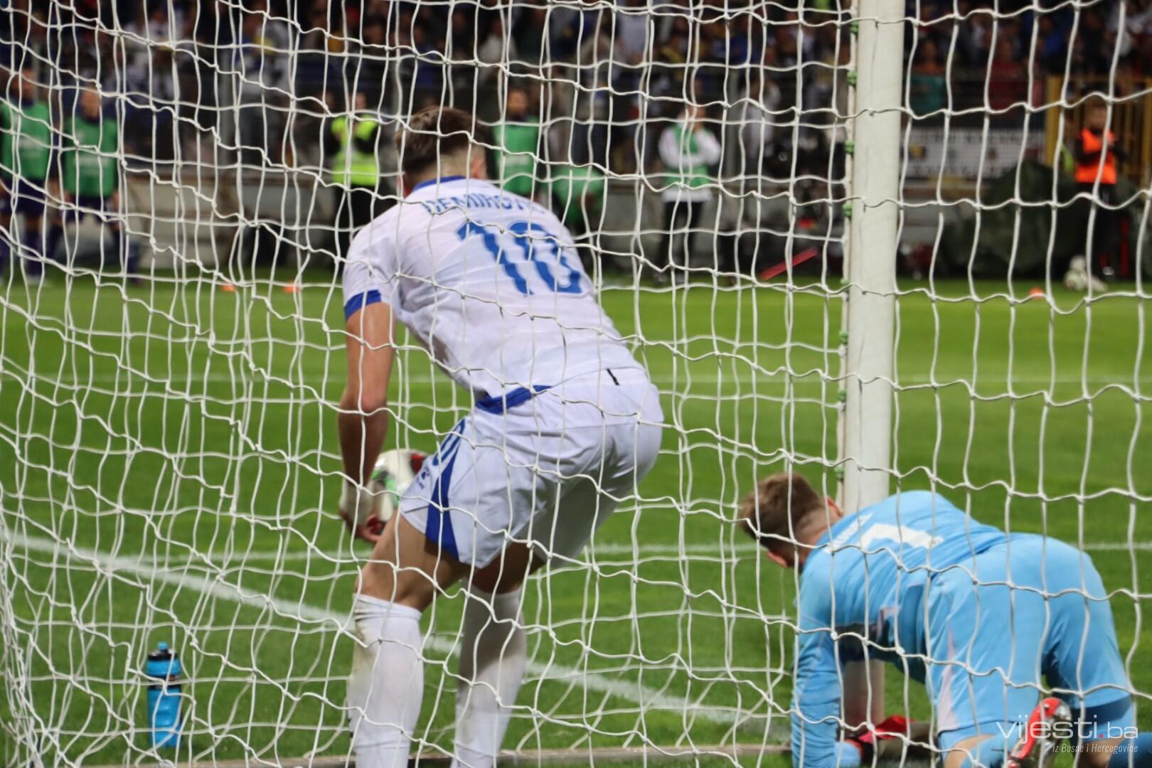Naš tim je dobro ušao u meč i zaprijetio već u 4. minuti preko Bašića iz slobodnog udarca. Pet minuta kasnije, Džeko je centrirao, a Demirović iz nezgodne pozicije uhvatio volej ali lopta odlazi visoko preko gola.