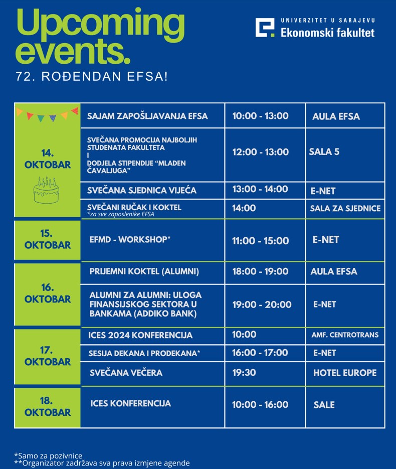 U periodu od 14. do 18. oktobra 2024. godine, Ekonomski fakultet Univerziteta u Sarajevu će svečano proslaviti 72 godine svog postojanja i rada i tim povodom organizovati niz važnih događaja.