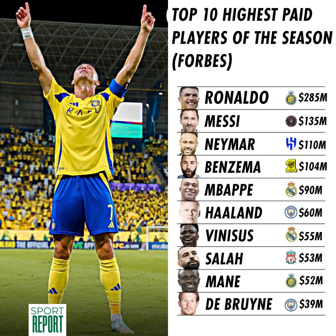 Kylian Mbappé (25) je jedini na ovom popisu koji je ljetos promijenio klub, iz Paris Saint-Germaina je bez odštete prešao u Real Madrid. Od fudbala prihoduje 70 miliona dolara, a iz ostalih prihoda 20 dolazi mu 20 miliona. Od PSG-a i dalje potražuje 60 miliona dolara neisplaćenih plaća, a spor će se rješavati na sudu.