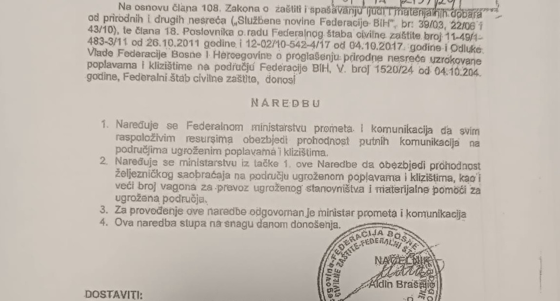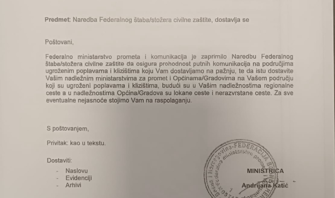 Prema dopisima, u koje imamo uvid, još 4. oktobra Federalni štab civilne zaštite uputio je naredbu Ministarstvu saobraćaja FBiH "da svim raspoloživim resursima obezbijedi prohodnost putnih komunikacija na područjima ugroženim poplavama i klizištima".