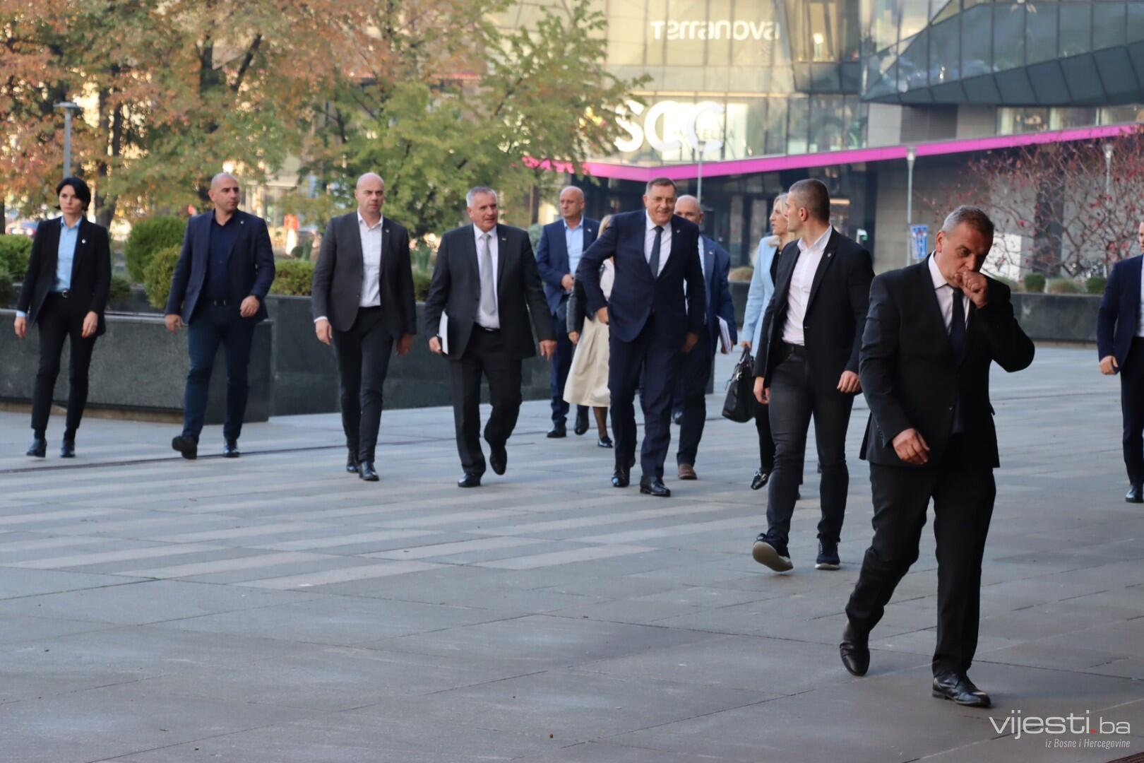 U delegaciji SDP_a stigli su predsjednik ove stranke Nermin Nikšić i politički direktor SDP-a Nerin Dizdar. Delegaciju HDZ-a predvodi Dragan Čović, a SNSD-a Milorad Dodik, koji je i posljednji stigao na današnji sastanak.