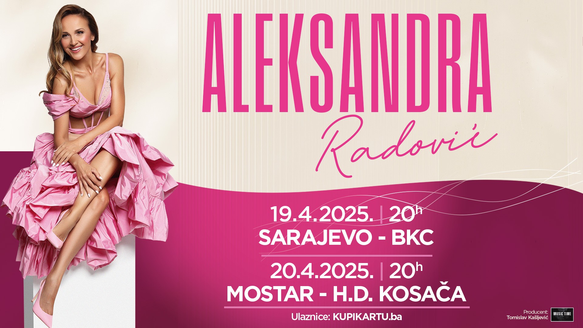 Jedna od najcjenjenijih pop umjetnica regije Aleksandra Radović održat će dva velika koncerta u Bosni i Hercegovini: 19. aprila 2025. u Bosanskom kulturnom centru (BKC) u Sarajevu i 20. aprila 2025. u HD HS Kosači u Mostaru.