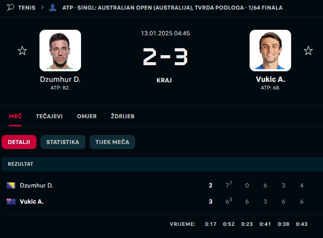 Džumhur je prvi set dobio rezultatom 7:6, a drugi izgubio bez osvojenog gema (6:0).