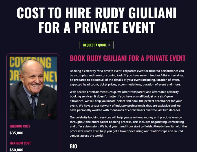 "Rezervišite Rudyja Giulianija za privatni događaj", piše na stranici samoprozvanog govornika, motivacijskog govornika, javnog demonstratora i čega sve ne.