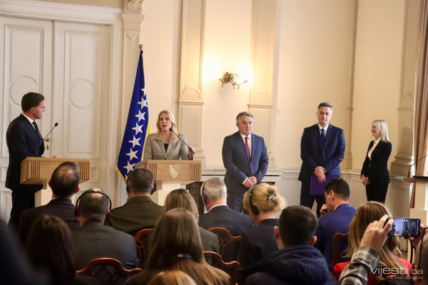 Generalni sekretar NATO Saveza Mark Rutte i članovi Predsjedništva BiH obratili su se javnosti nakon održanog jednosatnog sastanka u zgradi Predsjedništva BiH.