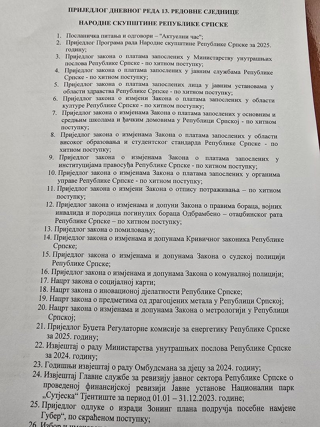 Za ponedeljak 24. aprila 2025. godine zakazana je 13. redovna sjednica Narodne skupštine RS, poslije tri mjeseca pauze, sa 26 tačaka Dnevnog reda.