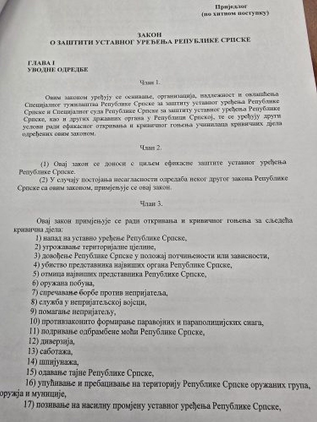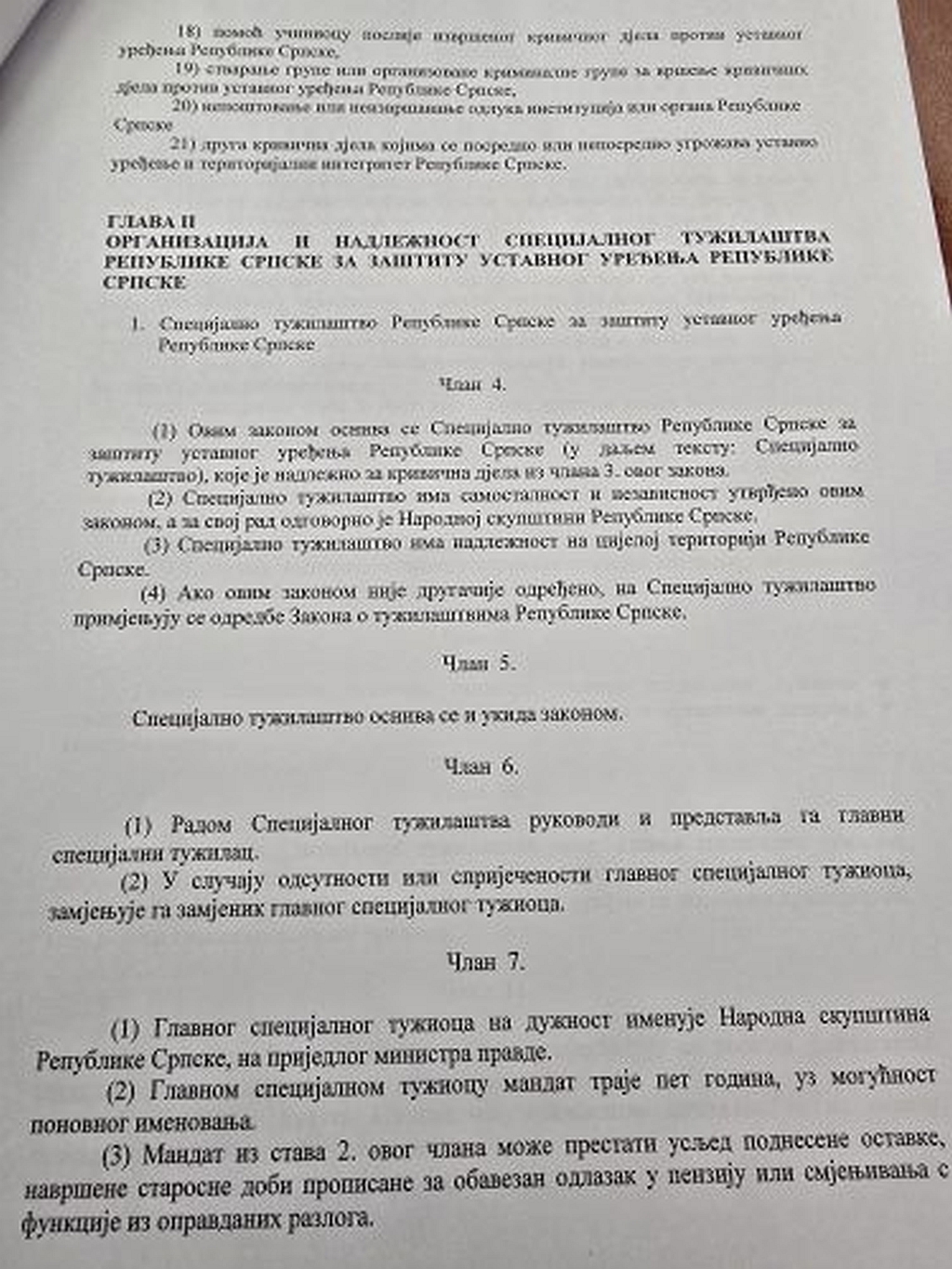 Planirano je po Zakonu i osnivanje Specijalnog tužilaštva za zaštitu ustavnog uređenja RS koji treba da progoni sve one koje Dodik i Sud Partije proglase špijunima i neprijateljima.