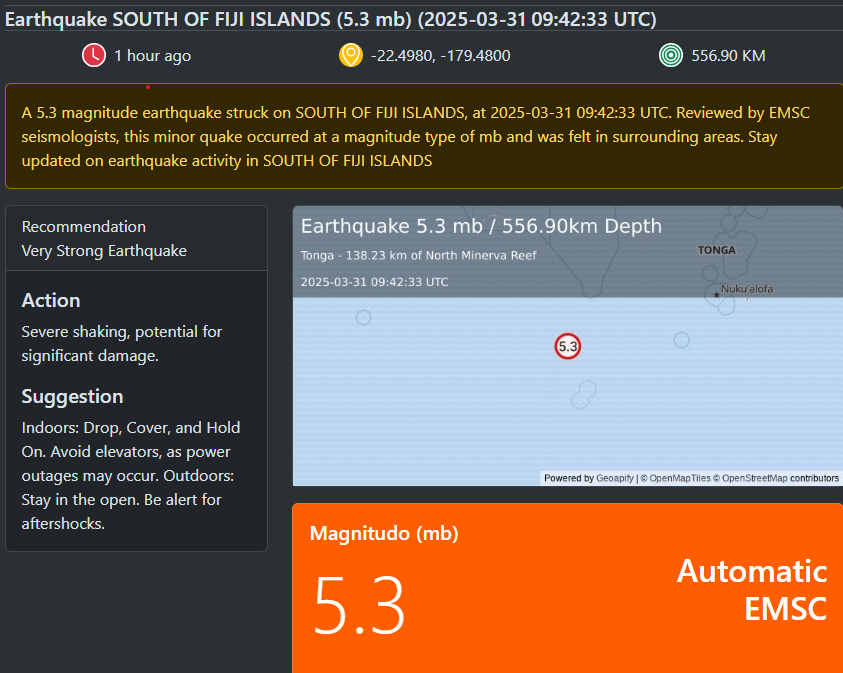 Zemljotres magnitude 5,3 stepena Rihtera zabilježen je danas u 11.42 sati, na području Fidžija.