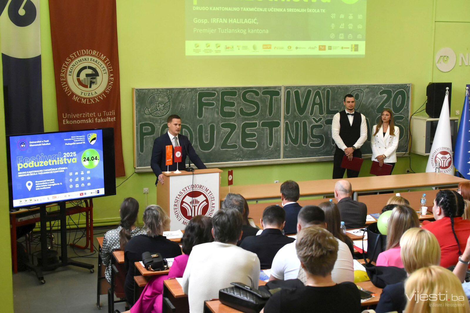 „Učenici danas ne predstavljaju samo svoje škole. Oni predstavljaju novu generaciju lidera, inovatora, preduzetnika. Ljudi koji će stvarati radna mjesta, rješavati probleme, donositi promjene. I to ne sutra – već danas. Njihove ideje, energija i hrabrost da razmišljaju drugačije nas nadahnjuje. Zbog toga festival poduzetništva srednjih škola Tuzlanskog kantona sjajan je primjer kako možemo i moramo ulagati u mlade ljude, njihove ideje i potencijal. Danas smo svjedoci da naši srednjoškolci ne samo da imaju znanje, već i viziju, hrabrost i preduzetnički duh koji su potrebni ovom društvu. Vlada Tuzlanskog kantona snažno podržava ovakve inicijative jer vjerujemo da se kroz obrazovanje i podsticanje inovacija gradi budućnost našeg kantona. Imajući u vidu sve ovo što se danas prezentira, učenicima želim da nikada ne prestanu vjerovati u sebe, da se ne boje neuspjeha jer svaki korak, pa i onaj težak, dio je puta ka uspjehu“, kazao je danas prilikom otvaranja Festivala premijer Tuzlanskog kantona Irfan Halilagić.