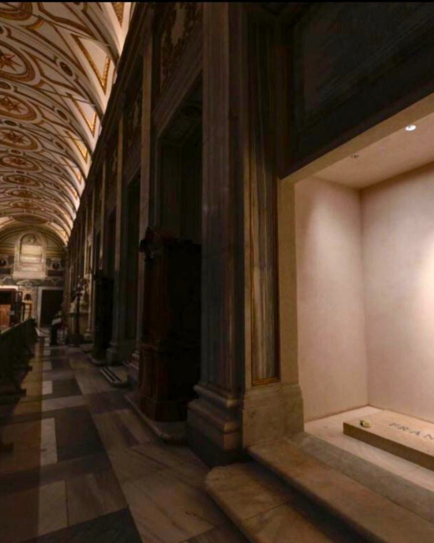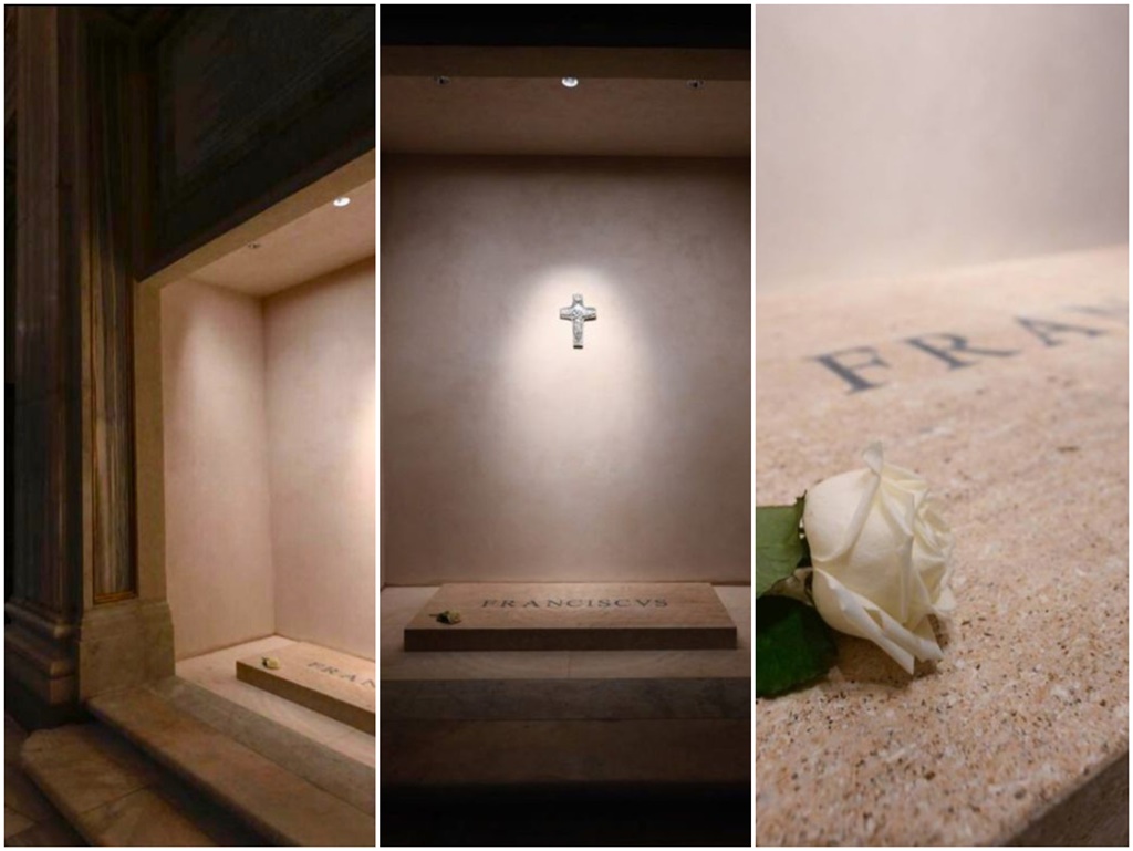 Na grobnoj ploči od ligurskog mermera ispisano je samo ime pape Franje na latinskom - Franciscus, koje je sada osvijetljeno reflektorom, a na zidu iznad groba nalazi se malo respeće.