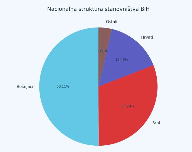 Kada je riječ o nacionalnoj strukturi, u BiH je tada evidentirano 50,11 posto stanovnika koji su se izjasnili kao Bošnjaci, njih 30,78 posto izjasnilo se kao Srbi, a Hrvata je 15,43 posto.