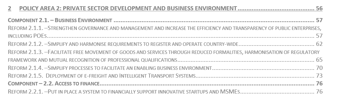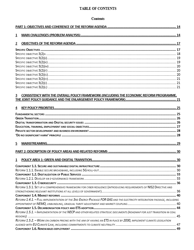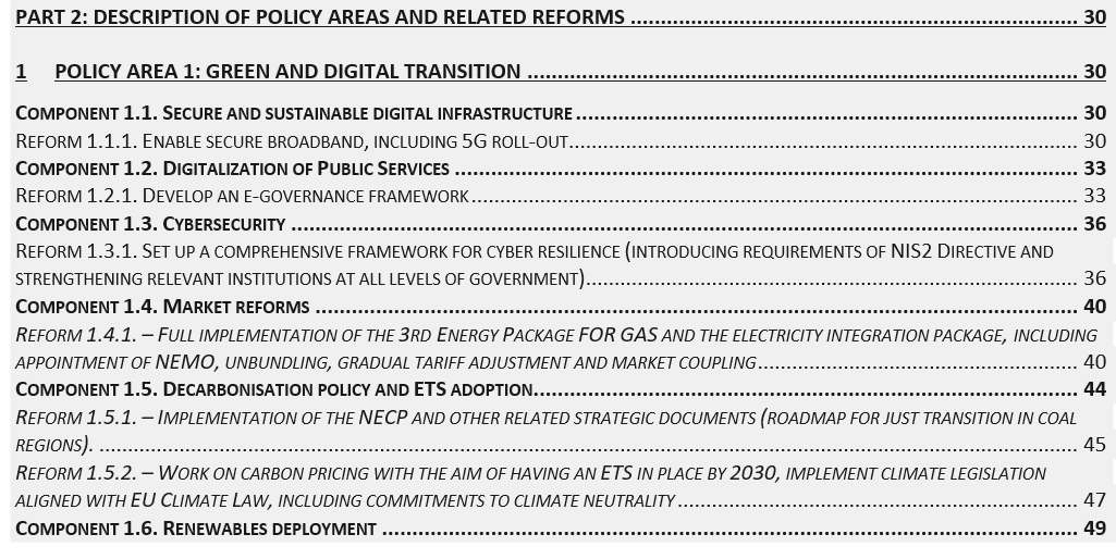 Plan je podijeljen na četiri cjeline: zelena i digitalna tranzicija, razvoj privatnog sektora, ljudski kapital i vladavina prava.