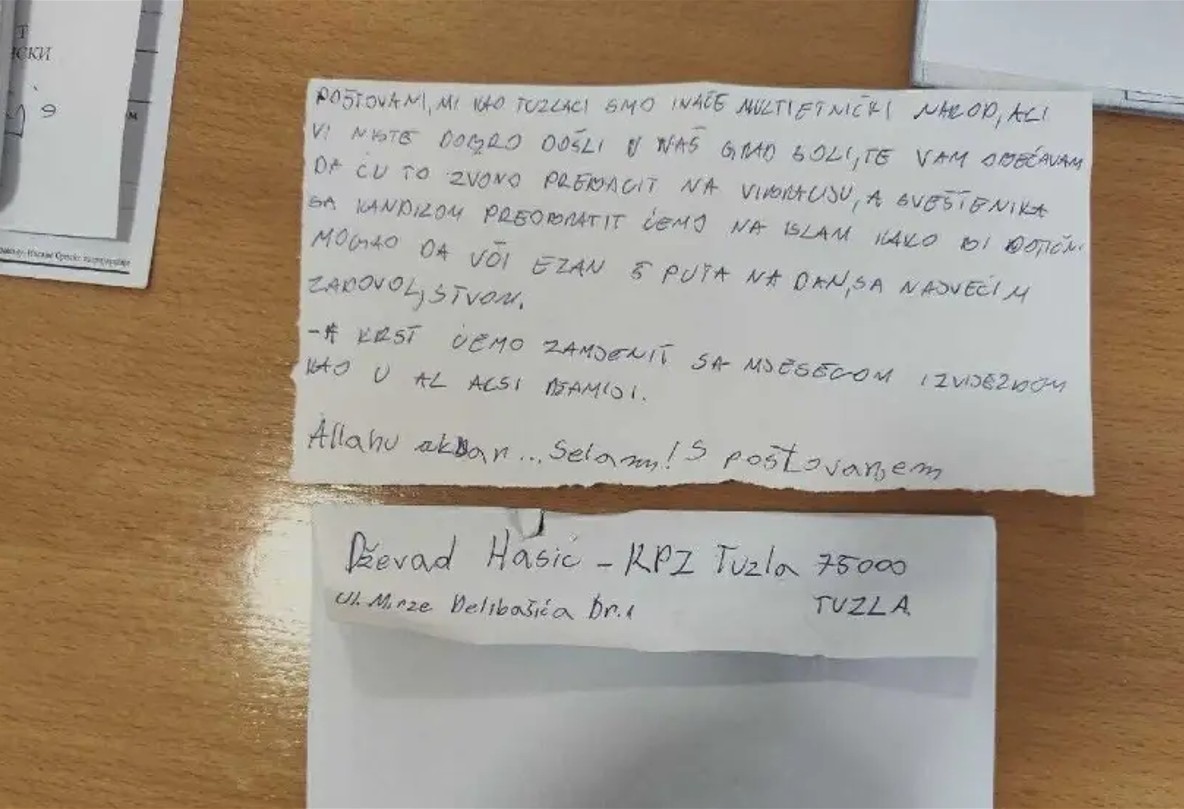 U prijetećoj poruci koja je rukom napisao ranije uhapšeni Dževad Hasić poručio je da sveštenstvo nije dobrodošlo u ovaj grad, te im "zbog toga obećava da će crkveno zvono prebaciti na vibraciju, a sveštenika sa kandilom će prebaciti na islam kako bi mogao da uči ezan pet puta na dan, sa najvećim zadovoljstvom".